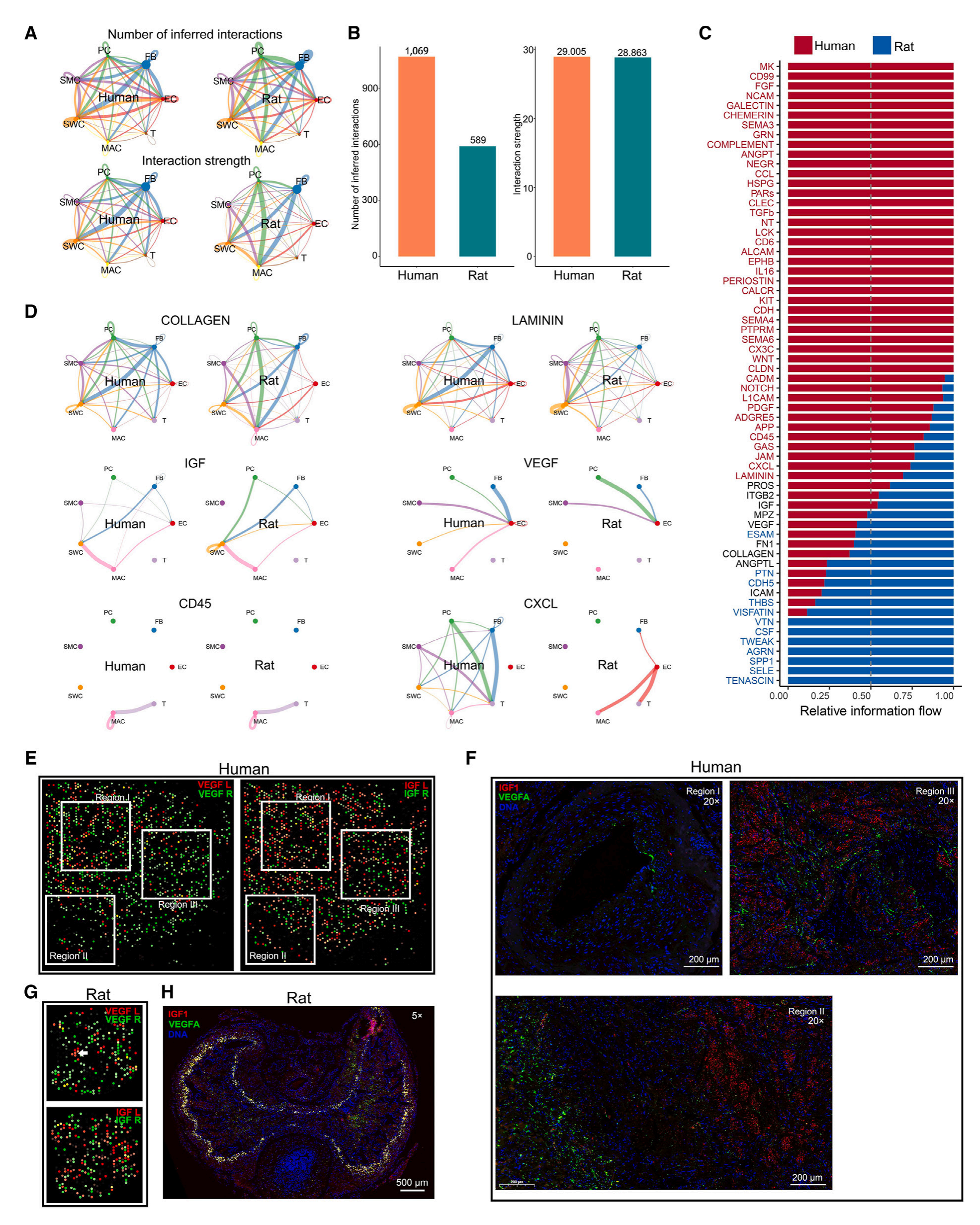 為了研究、比較人類和大鼠間CC微環(huán)境的復(fù)雜信號網(wǎng)絡(luò),研究者使用scRNA-seq數(shù)據(jù)進行CellChat分析,發(fā)現(xiàn)大鼠CC中的細(xì)胞互作數(shù)量雖然小于人類,但細(xì)胞互作強度是相似的?;谶@些互作的表達模式,研究者進行簡單的分類,發(fā)現(xiàn)雖然胞外基質(zhì)相關(guān)的互作整體強度與細(xì)胞類型間配體-受體強度相當(dāng),但兩者基因組成是有差異的;血管生成相關(guān)的互作整體強度在人類和大鼠中沒有差異,但基因組成存在差異,如大鼠CC微環(huán)境中是主要是VEGFB表達,而人類CC微環(huán)境中高表達的是VEGFA和IGF1。