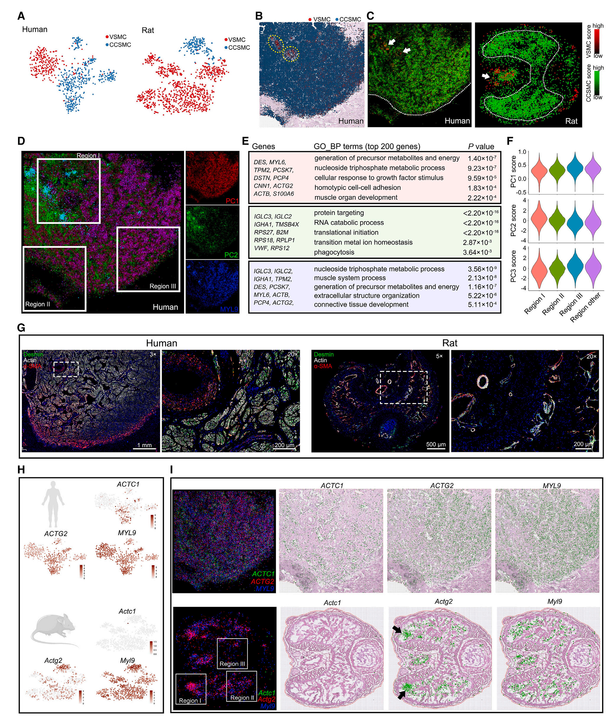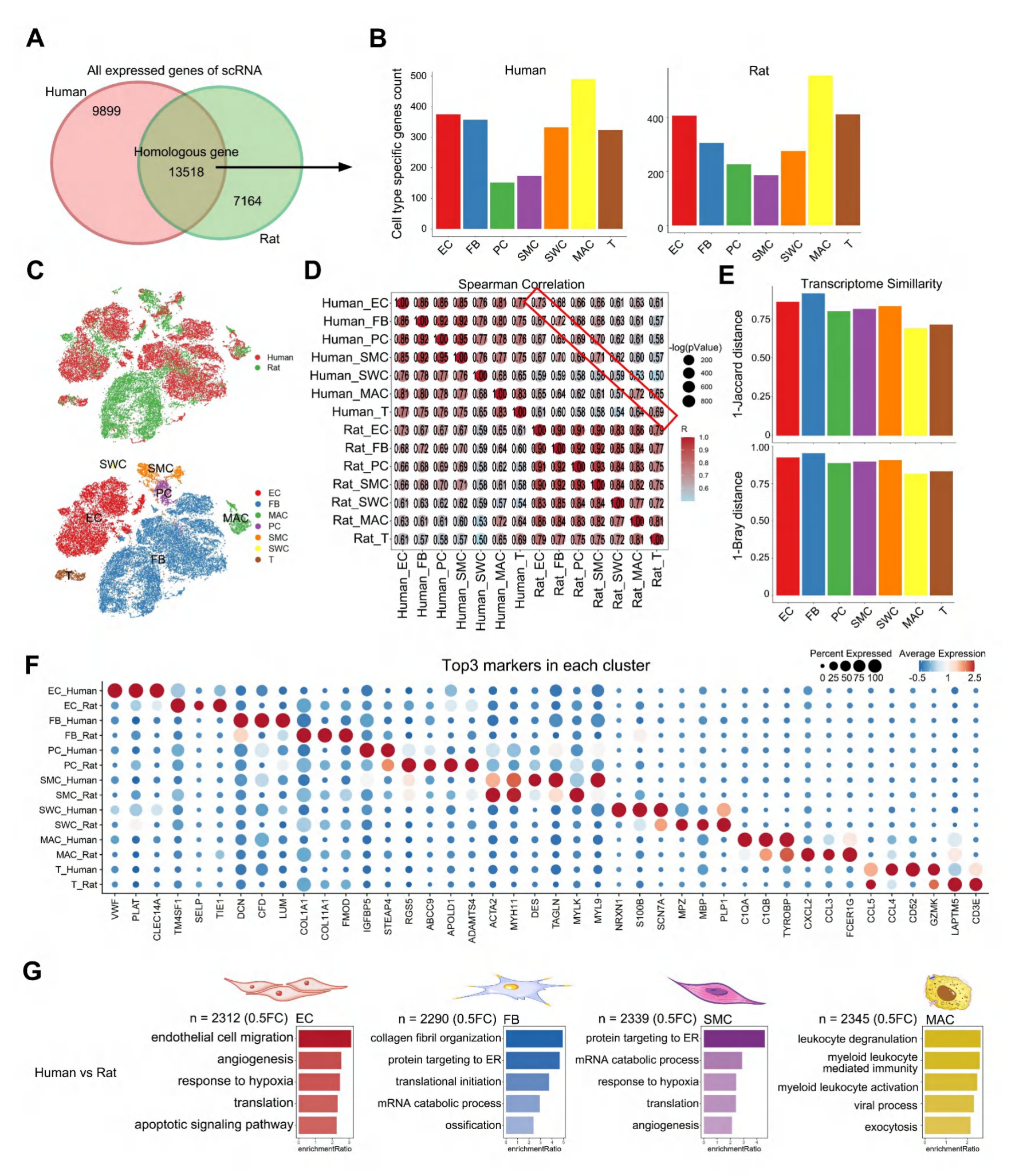 通過分析空間轉(zhuǎn)錄組數(shù)據(jù)中的人—鼠同源基因,研究者找到人類和大鼠共有的459個top SVG,大多數(shù)SVG并不是細(xì)胞類型特異的,其中EC、FB和SMC是表達這些SVG最多的3種類型細(xì)胞。富集分析結(jié)果顯示,基礎(chǔ)生物學(xué)過程如“translational initiation”、“extracellular structure organization”以及“protein targeting”,在人類和大鼠CC組織的空間轉(zhuǎn)錄組數(shù)據(jù)中是保守的;人類特異SVG主要與炎癥響應(yīng)有關(guān),而這些SVG的大鼠同源基因主要與代謝過程有關(guān)。