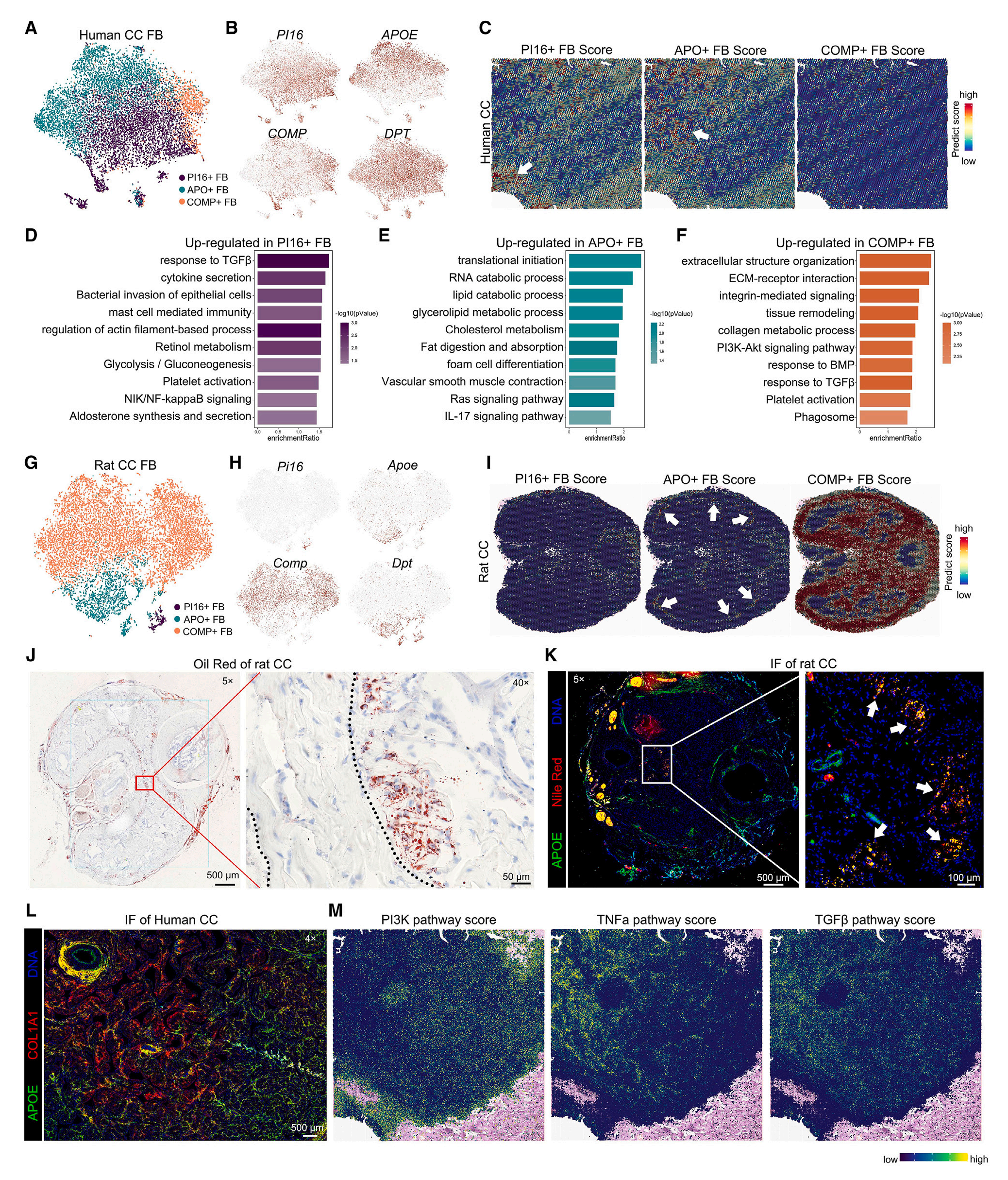 近期,CC的FB(成纖維細(xì)胞)成為研究熱點,但對其空間和物種異質(zhì)性仍不清楚。研究者根據(jù)PI16、APOE及其他載脂蛋白、COMP的表達情況,將人類CC FB分成3種亞群??臻g轉(zhuǎn)錄組數(shù)據(jù)分析結(jié)果顯示,人類CC中3種FB亞群空間分布模式不同,富集的功能也不同;大鼠CC FB表現(xiàn)出與人類CC FB相似的亞群和標(biāo)志基因,但每種亞群的比例與人類顯著不同。
