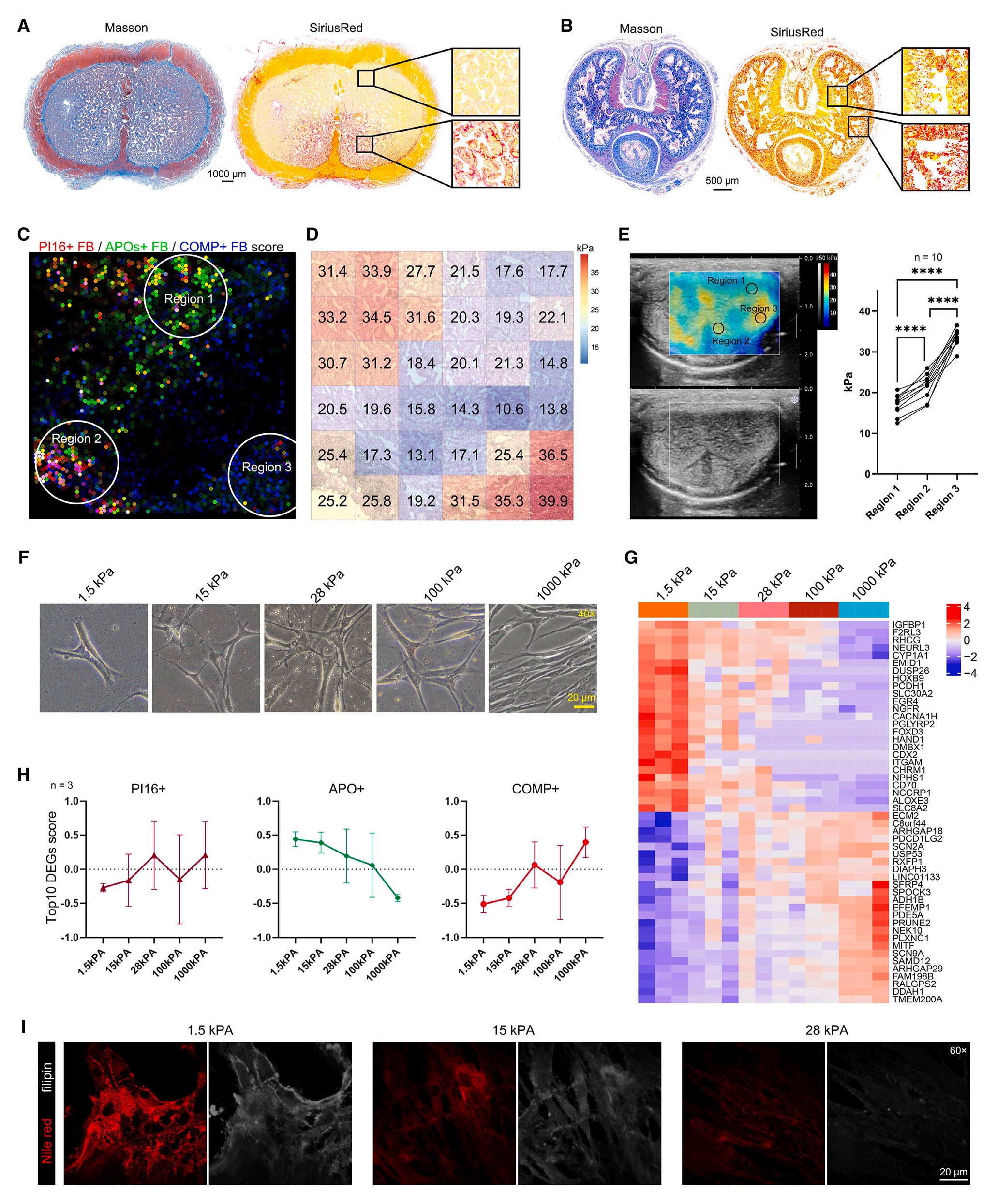 本研究中,研究者發(fā)現(xiàn)COMP+ FB生態(tài)位顯著富集了“integrin-mediated signaling pathway”和“response to mechanical stimulus”term;人和大鼠CC中ECM/細(xì)胞組成比例表現(xiàn)出明顯的空間異質(zhì)性;空間轉(zhuǎn)錄組數(shù)據(jù)和免疫熒光染色結(jié)果類似,靠近陰莖背神經(jīng)血管束的上極區(qū)域顯示出較低的纖維化水平,而遠(yuǎn)離背神經(jīng)血管束的顯示出較高的纖維化水平;空間轉(zhuǎn)錄組數(shù)據(jù)和超聲彈性成像結(jié)果都表明,APO+ FB與更柔軟的組織硬度有關(guān),而COMP+ FB與更硬的組織有關(guān);不同胞外基質(zhì)硬度培養(yǎng)下的CC FB形態(tài)不同,bulk RNA-seq數(shù)據(jù)顯示機械應(yīng)激顯著改變了FB的轉(zhuǎn)錄狀態(tài),一些參與調(diào)控脂質(zhì)代謝的基因與低機械力信號有關(guān);scRNA-seq數(shù)據(jù)分析結(jié)果顯示APO+ FB分值隨組織硬度增加而降低,COMP+ FB分值隨組織硬度增加而增加;染色結(jié)果顯示隨著組織硬度增加,F(xiàn)B中的中性脂質(zhì)和膽固醇累積降低。