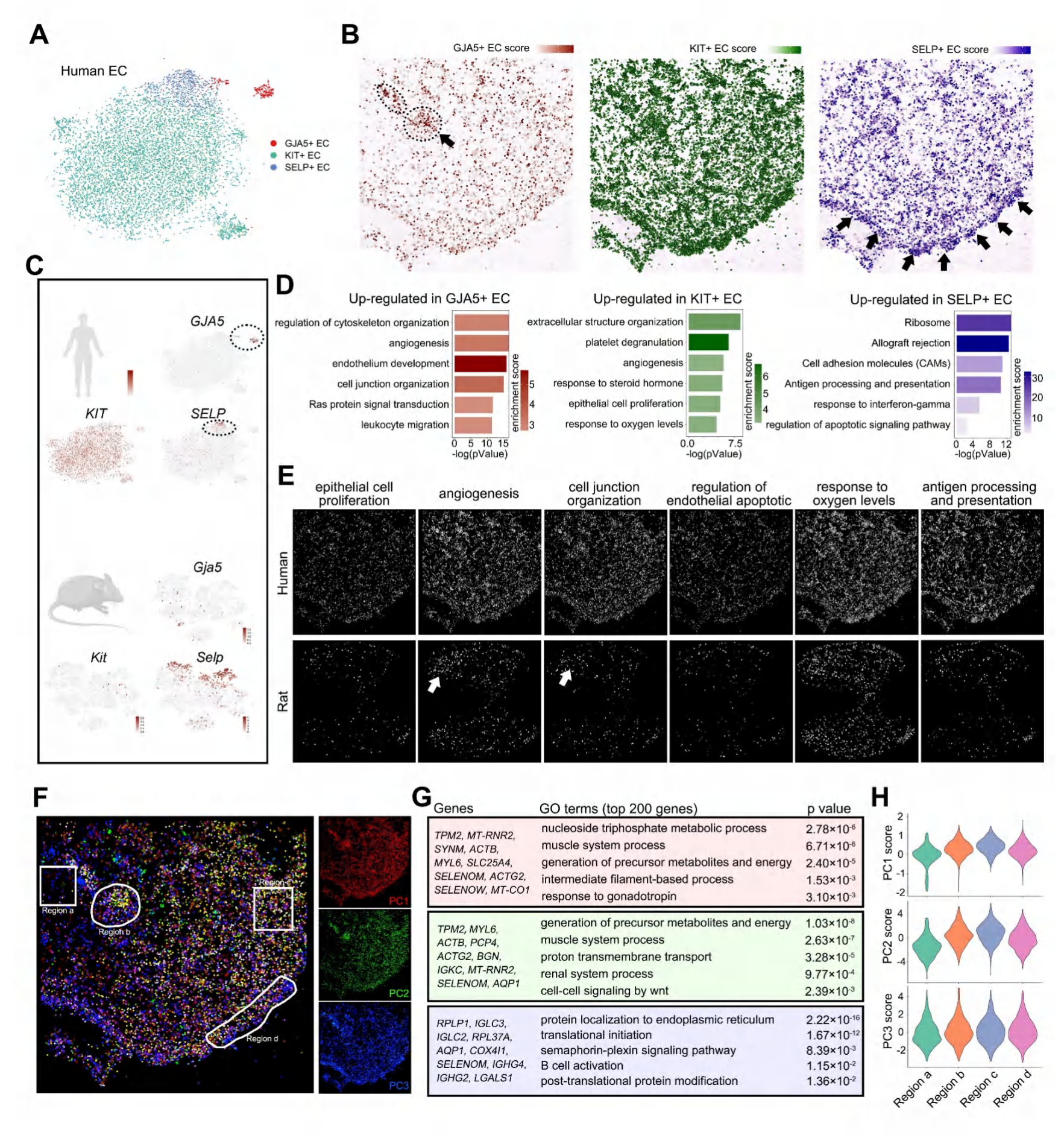 根據(jù)以往的解剖觀察以及scRNA-seq數(shù)據(jù)分析,可知CC中包含3種類型EC(內(nèi)皮細(xì)胞),包括GJA5+ EC(動脈內(nèi)皮細(xì)胞)、SELP+ EC(靜脈內(nèi)皮細(xì)胞)以及KIT+ EC(海綿體竇內(nèi)皮細(xì)胞)。人類CC中GJA5+ EC占比最低,主要分布在海綿體動脈區(qū)域;SELP+ EC主要分布在白膜區(qū)域;KIT+ EC廣泛分布。但大鼠CC中,Selp+ EC比例更高,Gja5和Kit可能并不是有用的靜脈和CC內(nèi)皮細(xì)胞標(biāo)志物?;趕cRNA-seq數(shù)據(jù)進行GO分析,研究者發(fā)現(xiàn)不同類型EC富集了不同功能,多數(shù)細(xì)胞類型特異性的term(條目)在人類CC中并沒有空間分布異質(zhì)性,但一些特殊term在大鼠CC中表現(xiàn)出空間分布異質(zhì)性。