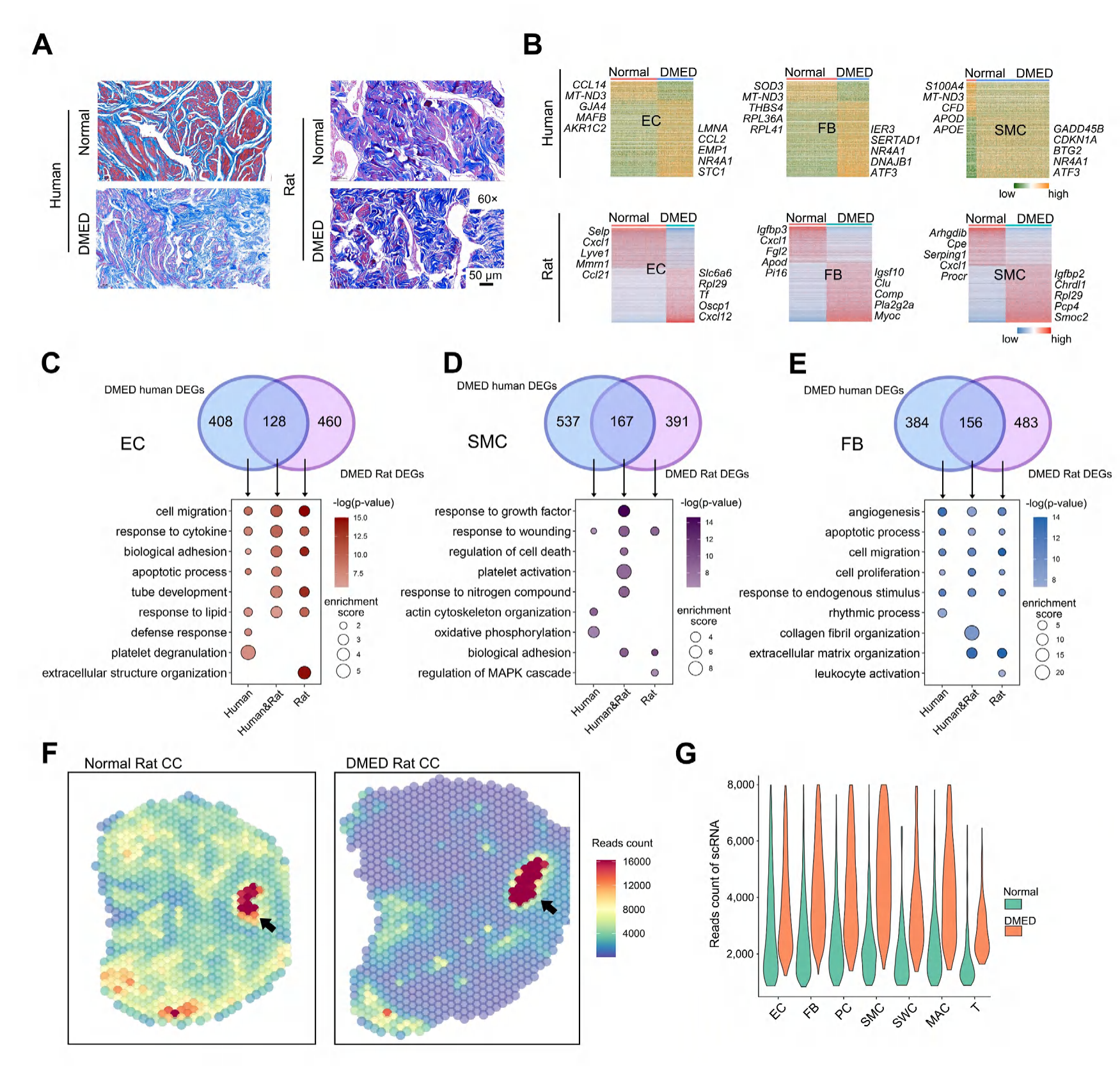 為了更好的認(rèn)識DMED病理條件下,人類和大鼠CC微環(huán)境發(fā)生的變化是否與每種CC細(xì)胞類型中發(fā)生的分子水平變化相一致,研究者通過分析scRNA-seq數(shù)據(jù),發(fā)現(xiàn)DMED大鼠模型和DMED患者都經(jīng)歷了顯著的纖維化以及細(xì)胞組分丟失,但兩者間的轉(zhuǎn)錄組差異顯著。富集分析結(jié)果顯示,僅DMED大鼠模型富集了“extracellular structure organization”;“actin cytoskeleton or organization”和“oxidative phosphorylation”僅在人類DMED患者SMC中發(fā)現(xiàn),“regulation of MARK cascade”僅在DMED大鼠模型SMC中富集;“rhythmic process”僅在人類DMED患者FB中富集,“l(fā)eukocyte activation”僅在DMED大鼠模型FB中富集。