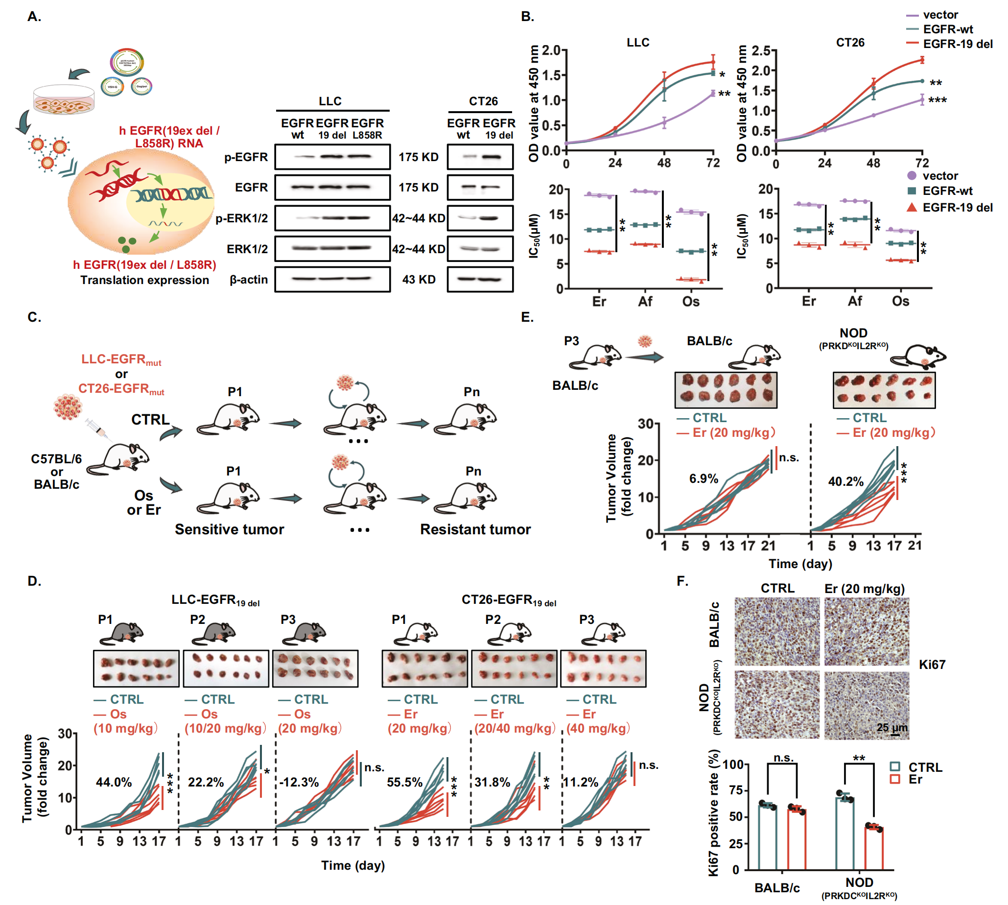 使用攜帶 EGFR 突變的小鼠細(xì)胞系建立了異位異種移植腫瘤模型,并評估了對不同代 EGFR-TKI 的反應(yīng),揭示腫瘤耐藥機制。