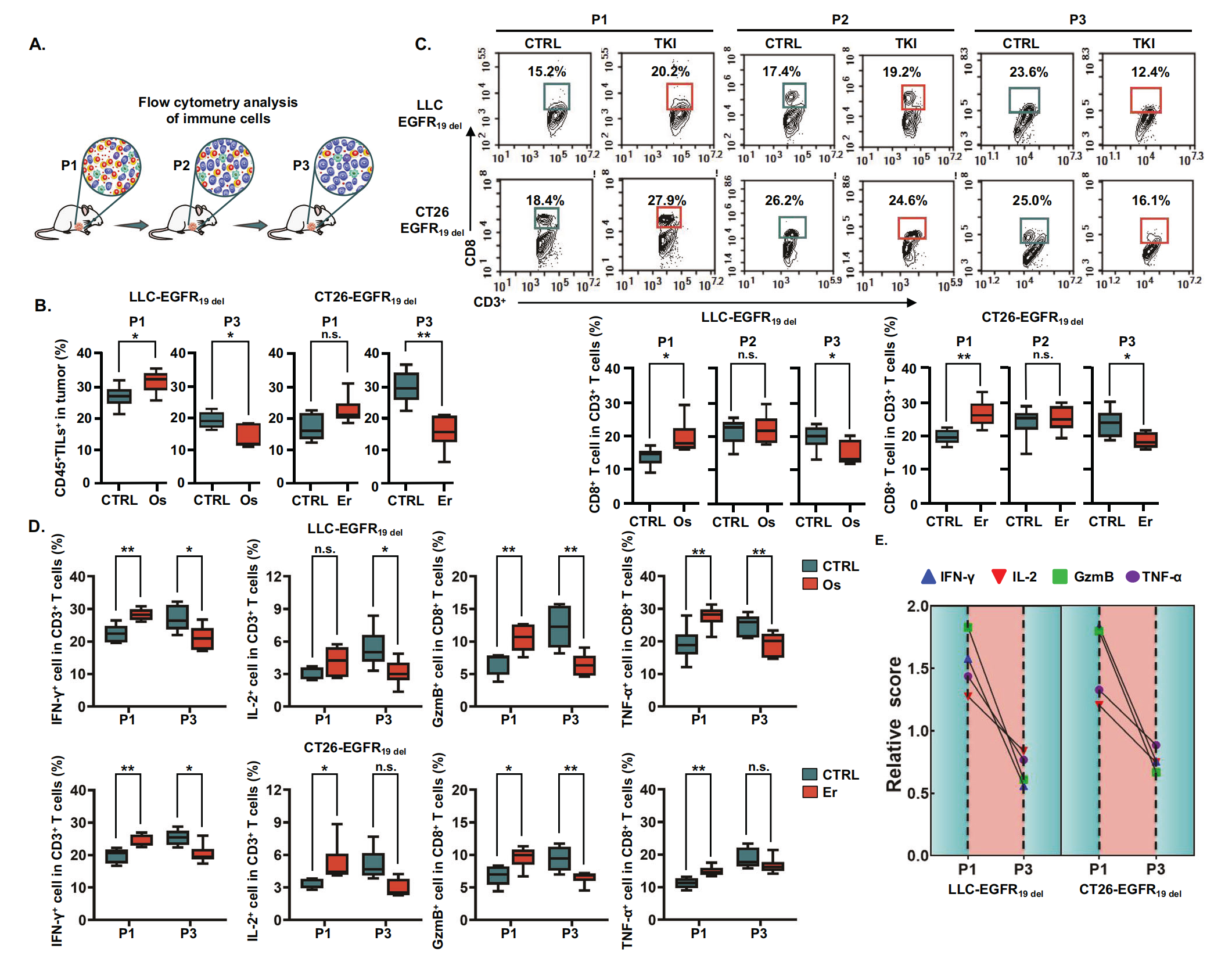 為了了解腫瘤免疫環(huán)境如何參與對 EGFR-TKI 的耐藥性,作者分析了治療過程中不同階段的腫瘤免疫環(huán)境特征(圖 2A)。作者測定了初始 EGFR-TKIs 治療時和耐藥發(fā)展期間 (P1-P3) 腫瘤免疫環(huán)境中腫瘤浸潤白細(xì)胞 (TIL) 的密度,其中用鹽水處理的腫瘤細(xì)胞作為 CTRL 組,用厄洛替尼或奧希替尼治療的腫瘤細(xì)胞作為 TKI 組。流式細(xì)胞術(shù)分析的免疫分析顯示,在治療早期,攜帶 EGFR19del?的腫瘤的 EGFR-TKIs 治療誘導(dǎo)腫瘤浸潤白細(xì)胞比例增加(圖2B)。然而,當(dāng)荷瘤小鼠對 EGFR-TKI 產(chǎn)生耐藥性時,與 CTRL 組相比,腫瘤浸潤白細(xì)胞的比例顯著降低(圖2B)。這表明荷瘤小鼠對 EGFR-TKIs 的反應(yīng)性改變伴隨著腫瘤免疫環(huán)境的動態(tài)變化。