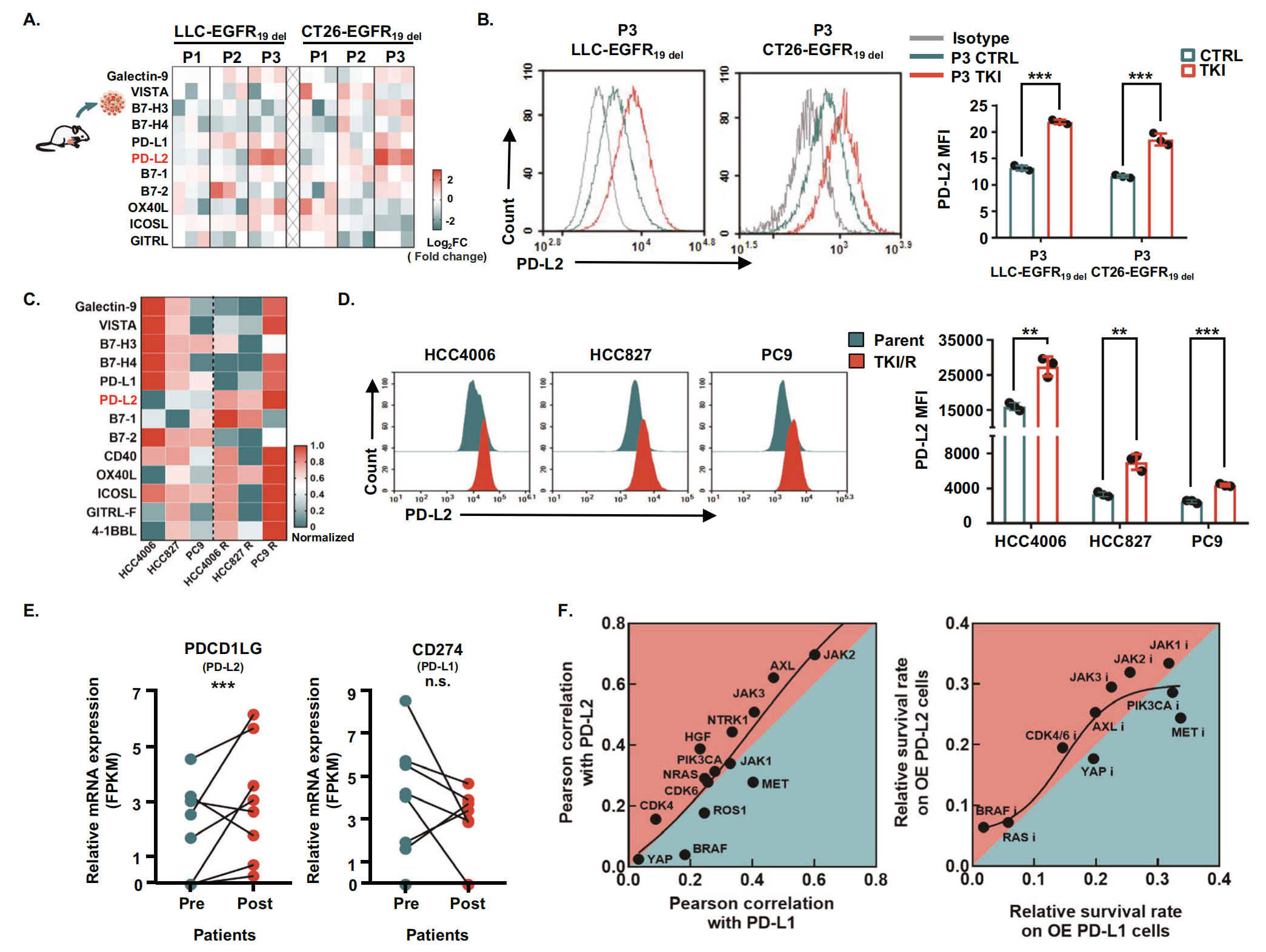 為了探索腫瘤免疫環(huán)境變化的原因,作者同時檢測了不同傳代階段腫瘤組織中刺激性和抑制性免疫調(diào)節(jié)分子的表達。在 EGFR-TKI 的初始治療中,一些抑制性免疫檢查點的相對表達降低(圖隨著耐藥性的出現(xiàn),抑制性免疫檢查點基因 PD-L1 和 PD-L2 的相對表達水平逐漸升高,尤其是 PD-L2 (圖3A)。為了進一步驗證 PD-L2 在 EGFR-TKI 耐藥腫瘤細(xì)胞中表達的增加,作者通過流式細(xì)胞術(shù)鑒定了 PD-L2 在 P3 腫瘤細(xì)胞厄洛替尼或奧希替尼處理的腫瘤細(xì)胞(耐藥,TKI 組)表面的表達,以生理鹽水處理的細(xì)胞為對照(敏感,CTRL 組)。作者的結(jié)果表明,與對照組織相比,腫瘤細(xì)胞表面 PD-L2 的表達在耐藥腫瘤組織中表現(xiàn)出顯著增加(圖3B)。接下來,為了進一步驗證,作者分析了先前構(gòu)建的 EGFR 突變的 TKI 耐藥 NSCLC 細(xì)胞系 HCC4006R、HCC827R、PC9R 及其配對親本細(xì)胞中免疫檢查點標(biāo)志物的表達水平。在三種耐藥細(xì)胞系中,PD-L2 的 mRNA 和蛋白表達水平顯著上調(diào),而 PD-L1 的表達表現(xiàn)出不一致的變化(圖3C、D)。