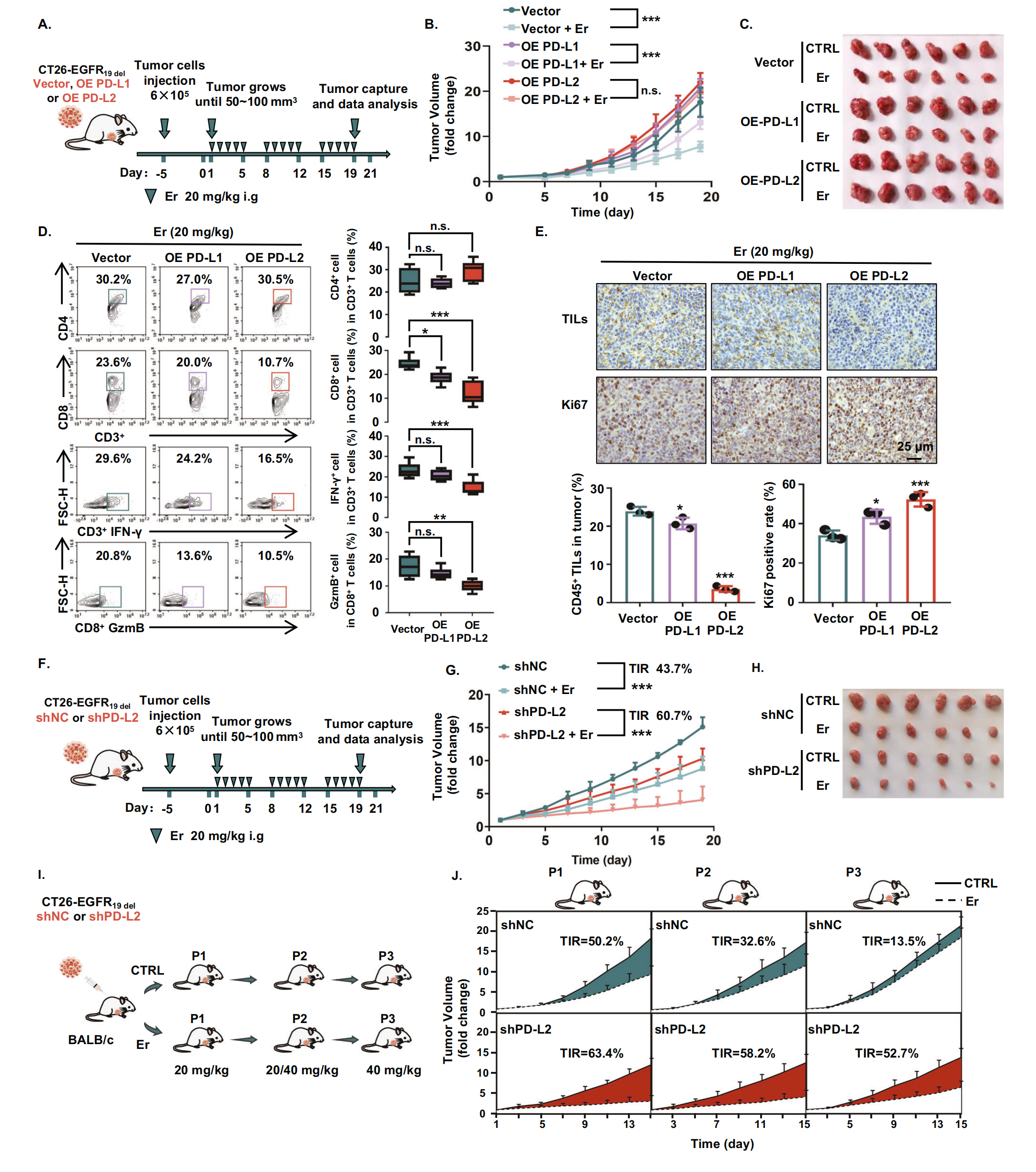 為了研究 PD-L2 表達在免疫系統(tǒng)中的獨特作用和對 EGFR-TKI 的反應(yīng),作者在 CT26-EGFR19del?細(xì)胞系中過表達 PD-L1 和 PD-L2,并建立了 BALB/c 同基因小鼠模型(圖 4A)。使用攜帶空載體的 CT26-EGFR19del細(xì)胞系作為對照。作者通過測量腫瘤體積評估空載體組、PD-L1 過表達組和 PD-L2 過表達組小鼠腫瘤對厄洛替尼治療的敏感性。結(jié)果顯示,與空載體組相比,PD-L2 過表達組小鼠對厄洛替尼的腫瘤耐藥性顯著增加,但 PD-L1 過表達組對厄洛替尼的腫瘤耐藥性沒有增加(圖4B,C)。這些結(jié)果表明,PD-L2 的過表達會增加腫瘤細(xì)胞對 EGFR-TKIs 的耐藥性。為了進一步證實作者的發(fā)現(xiàn),作者檢查了 PD-L1 或 PD-L2 過表達對 EGFR-TKIs 治療荷瘤小鼠腫瘤免疫環(huán)境中 T 細(xì)胞浸潤和細(xì)胞因子產(chǎn)生的影響。結(jié)果顯示,CD4+?T 細(xì)胞占總 CD3+?T 細(xì)胞的比例在 3 組間差異不顯著。值得注意的是,與空載體組相比,PD-L2 過表達組的 CD8+?T 細(xì)胞占總 CD3+?T 細(xì)胞的百分比以及細(xì)胞因子 IFN-γ 和顆粒酶 B 的表達顯著降低(圖 4D)。然而,PD-L1 過表達組中的細(xì)胞因子 IFN-γ 和顆粒酶 B 沒有顯著變化(圖 4D)。免疫組化染色顯示,與空載體和 PD-L1 過表達組相比,PD-L2 過表達組腫瘤細(xì)胞增殖顯著增加(圖4E)。以上結(jié)果進一步表明,PD-L2 在厄洛替尼治療期間在抑制免疫反應(yīng)、抑制細(xì)胞毒性 T 細(xì)胞浸潤和減少小鼠效應(yīng)細(xì)胞因子產(chǎn)生方面起主導(dǎo)作用。因此,作者得出結(jié)論,在 EGFR-TKIs 治療過程中,PD-L2 水平升高通過介導(dǎo)腫瘤細(xì)胞的免疫逃逸來抑制腫瘤細(xì)胞對 EGFR-TKIs 的治療反應(yīng)。