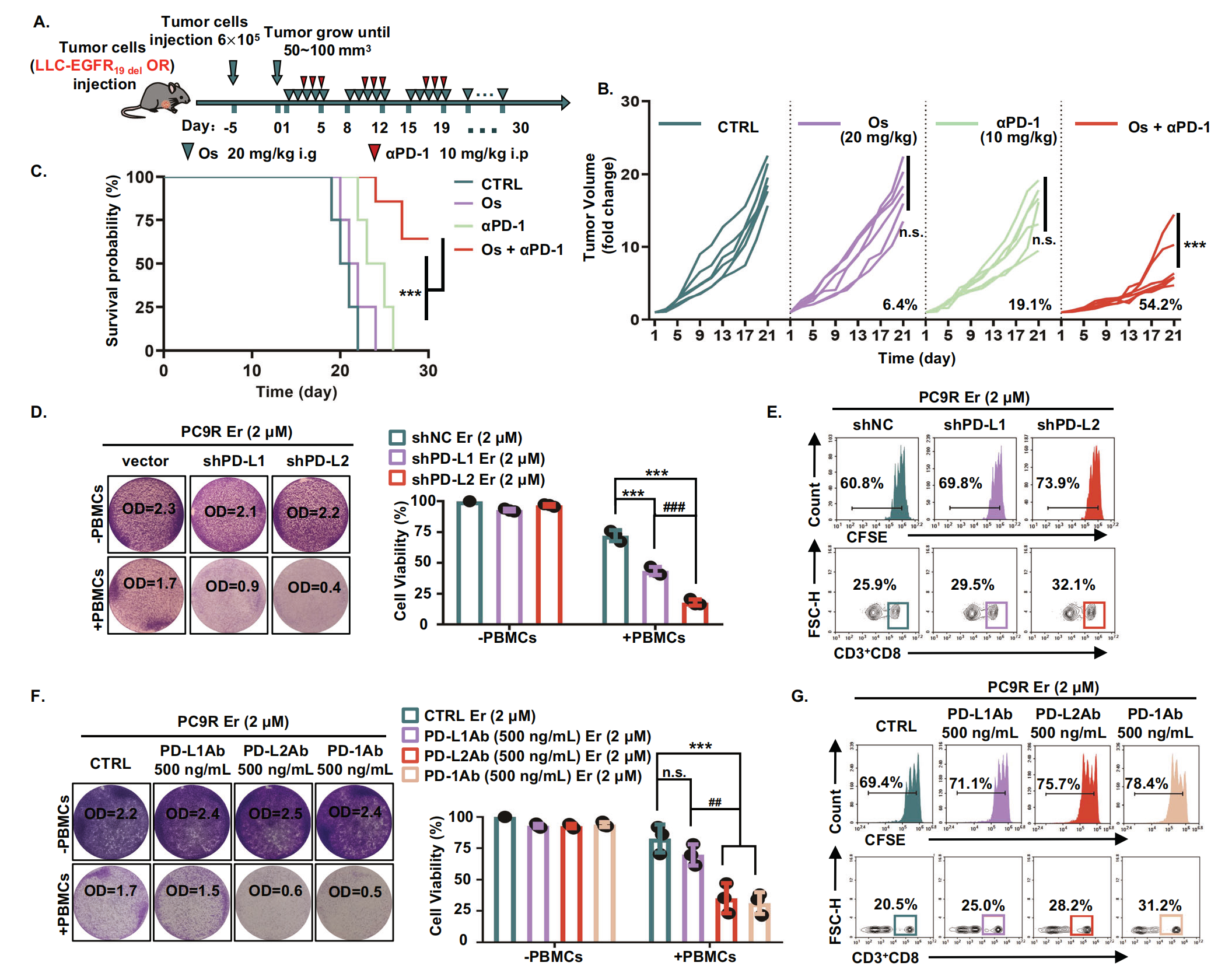 接下來,作者想進一步探討阻斷 EGFR-TKI 耐藥細(xì)胞中的 PD-L2/PD-1 是否可以通過增強免疫反應(yīng)來增強腫瘤細(xì)胞對 EGFR-TKIs 的敏感性。作者建立了攜帶對奧希替尼耐藥的 LLC-EGFR19del?衍生腫瘤的同基因小鼠模型。小鼠接受生理鹽水 (CTRL)、奧希替尼 (Os)、抗 PD-1 (αPD-1) 和奧希替尼 + 抗 PD-1 (Combi) 治療(圖5A)。作者的結(jié)果表明,與 CTRL 組相比,單獨使用奧希替尼組小鼠的腫瘤體積和生存時間沒有顯著差異。PD-1 抑制劑對 EGFR-TKI 耐藥腫瘤表現(xiàn)出部分抑制,并導(dǎo)致小鼠存活時間適度延長,盡管沒有統(tǒng)計學(xué)意義。然而,奧希替尼和抗 PD-1 的組合顯著抑制了腫瘤生長并延長了攜帶耐藥腫瘤的小鼠的生存期(圖5B,C)。以上結(jié)果表明,抑制 PD-1 與 EGFR-TKI 聯(lián)合有效抑制了 EGFR-TKI 耐藥腫瘤的生長。
