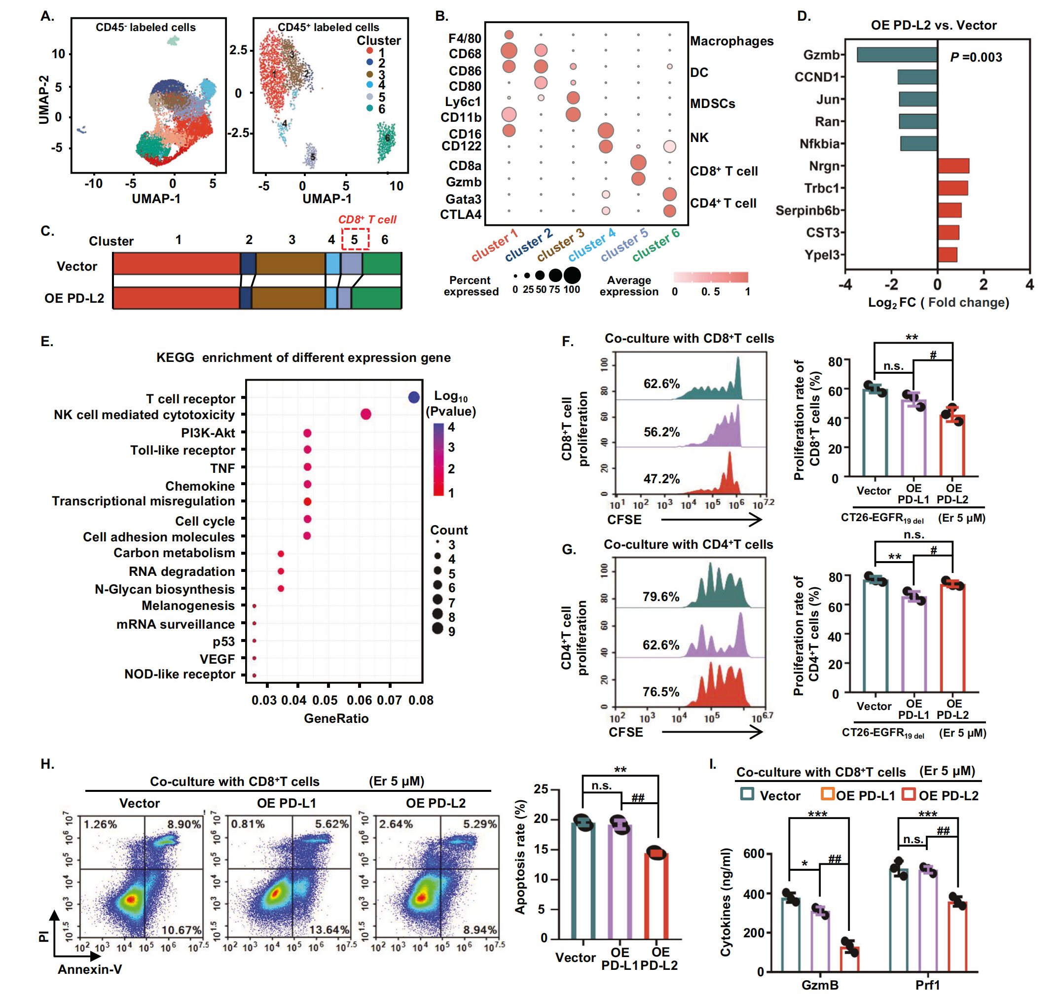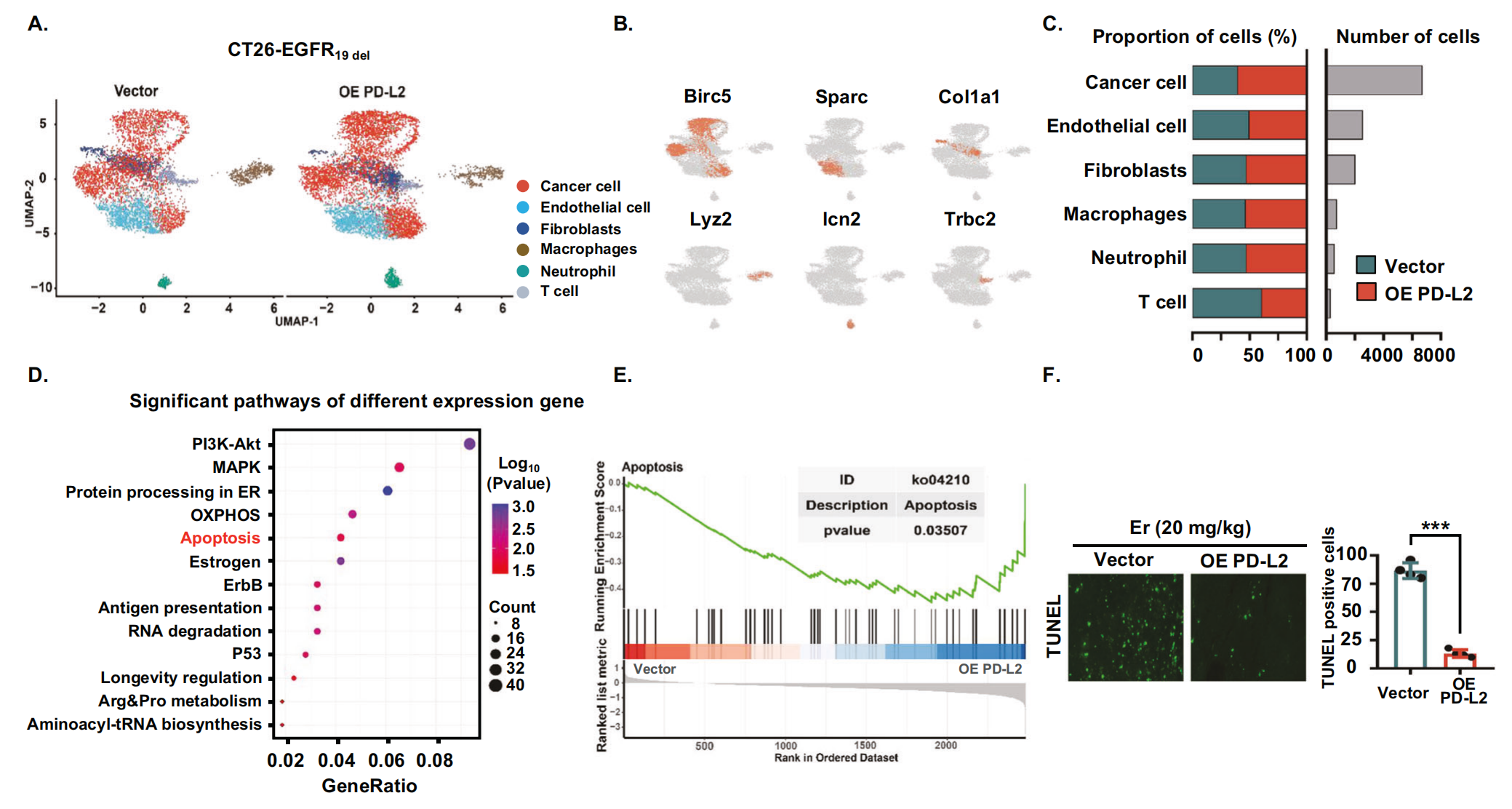 接下來,作者進一步探討了 PD-L2 表達升高影響免疫反應(yīng)以降低腫瘤對 EGFR-TKIs 敏感性的機制。作者獲得了來自空載體或 PD-L2 過表達的同基因小鼠中 CT26-EGFR19del?細(xì)胞的腫瘤組織的單細(xì)胞轉(zhuǎn)錄組譜。作者對來自空載體樣本和 PD-L2 過表達樣本的整合單細(xì)胞數(shù)據(jù)集進行了聚類分析,并確定了六個主要的不同細(xì)胞群(圖6A、B)。作者發(fā)現(xiàn) PD-L2 過表達組中癌細(xì)胞的數(shù)量顯著增加,T 細(xì)胞的比例顯著降低(圖6C)。為了探索 EGFR-TKIs 耐藥的機制,作者分析了癌細(xì)胞的轉(zhuǎn)錄組特征。與空載體組相比,對 PD-L2 過表達組的差異表達基因進行 KEGG 富集分析。作者觀察到細(xì)胞凋亡通路顯著富集(圖 6D)。GSEA 分析顯示,PD-L2 過表達組癌細(xì)胞中與細(xì)胞凋亡途徑相關(guān)的基因顯著下調(diào)(圖6E)。這些結(jié)果表明,EGFR 突變腫瘤細(xì)胞中 PD-L2 表達的增加可導(dǎo)致細(xì)胞凋亡減少。作者的體內(nèi)實驗數(shù)據(jù)進一步驗證了這些結(jié)論。TUNEL 染色顯示,與對照組相比,TKI 處理后 CT26-EGFR19del?PD-L2 過表達組腫瘤細(xì)胞凋亡受到顯著抑制(圖6F)。基于這些結(jié)果,作者假設(shè) EGFR 突變的腫瘤細(xì)胞中 PD-L2 表達增加會抑制癌細(xì)胞的凋亡,從而導(dǎo)致癌細(xì)胞的持續(xù)生長,耐藥性增加。