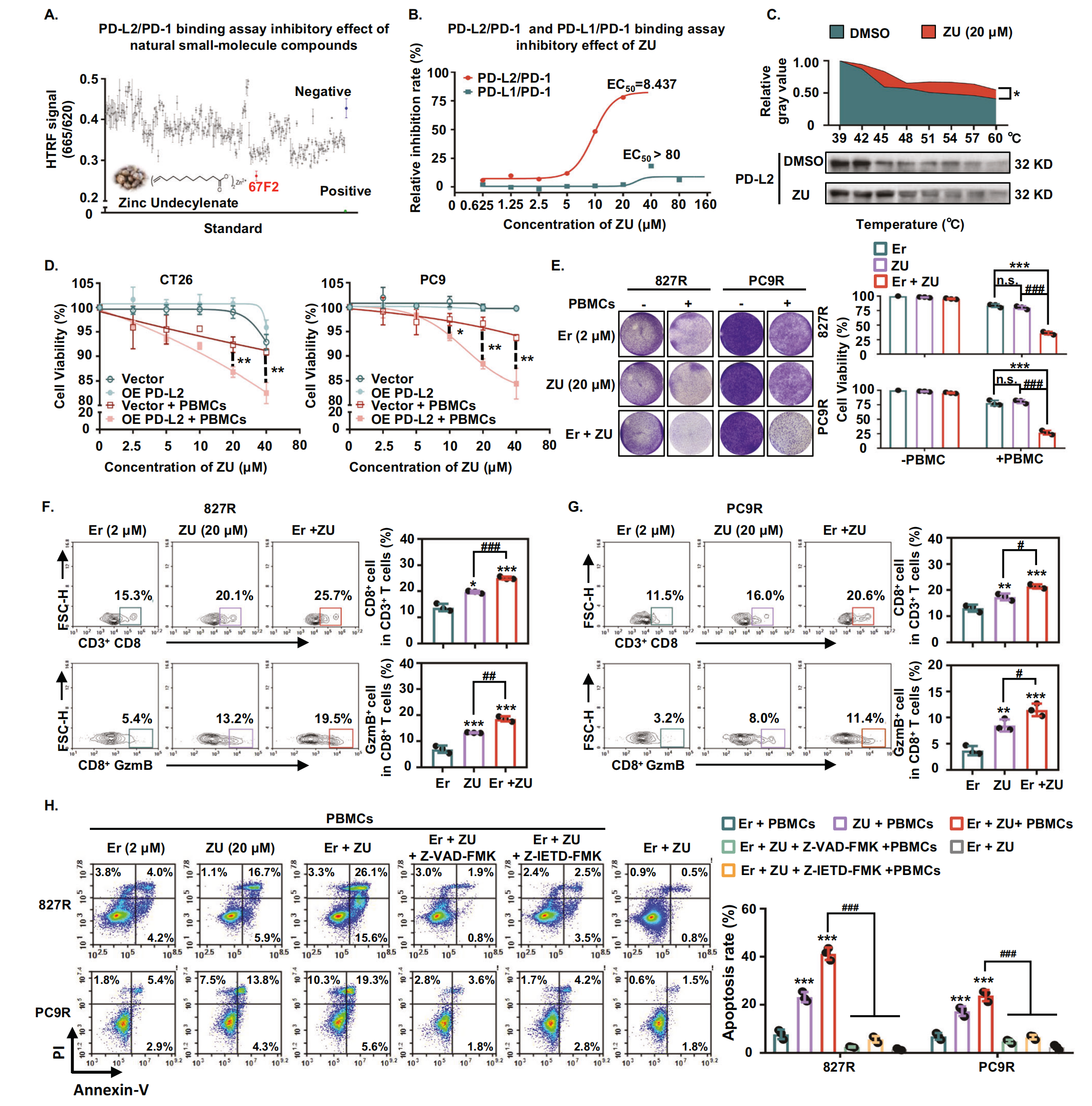 由于目前市場上沒有靶向 PD-L2 的藥物,作者使用 HTRF 技術(shù)篩選了 1300 多種天然小分子化合物的庫,以鑒定 PD-L2 的特異性抑制劑。作者發(fā)現(xiàn)了一種小分子化合物十一烯酸鋅 (ZU),它選擇性地抑制 PD-L2/PD-1 結(jié)合,EC50?8.4 μM,而 PD-L1/PD-1 為 >80 μM(圖8A, B)。ZU 是由蓖麻油通過一系列化學(xué)反應(yīng)和凈化過程生產(chǎn)的。CETSA 實驗表明,與 PD-L1/PD-1 相比,ZU 有效抑制了 PD-L2 與 PD-1 的結(jié)合(圖8C)。這些結(jié)果表明 ZU 具有阻斷 PD-L2/PD-1 相互作用的特異性能力。此外,作者利用空載體或 PD-L2 過表達的小鼠 CT26 細(xì)胞來驗證 ZU 的體外抗腫瘤作用。在 40 μM 濃度下,ZU 不會顯著降低 CT26 空載體和 PD-L2 過表達細(xì)胞的活力(圖8D),這表明 ZU 沒有直接的細(xì)胞毒性作用。然而,當(dāng)腫瘤細(xì)胞與活化的 T 細(xì)胞共培養(yǎng)時,與 CT26 空載體細(xì)胞相比,ZU (40 μM) 顯著抑制了 CT26 PD-L2 過表達細(xì)胞的活力(圖8D)。這表明 ZU 通過靶向 PD-L2/PD-1 的免疫調(diào)節(jié)發(fā)揮抗腫瘤作用。使用具有空載體和 PD-L2 過表達的 PC9 細(xì)胞獲得了類似的結(jié)果(圖8D)。此外,作者研究了 ZU 和 EGFR-TKI 對親本和 TKI 耐藥 NSCLC 細(xì)胞的聯(lián)合抑制作用。對于耐藥細(xì)胞,結(jié)果表明,厄洛替尼聯(lián)合 ZU 對 827 R 或 PC9R 細(xì)胞的生長抑制具有協(xié)同作用,與單獨使用厄洛替尼相比,耐藥細(xì)胞的存活率顯著降低(圖8E)。重要的是,在沒有活化的 T 細(xì)胞的情況下,厄洛替尼聯(lián)合 ZU 的細(xì)胞殺傷效果沒有顯著差異(圖8E)。上述結(jié)果進一步表明,靶向 PD-L2 的 ZU 與 EGFR-TKI 的組合對耐藥腫瘤表現(xiàn)出協(xié)同抑制作用。
