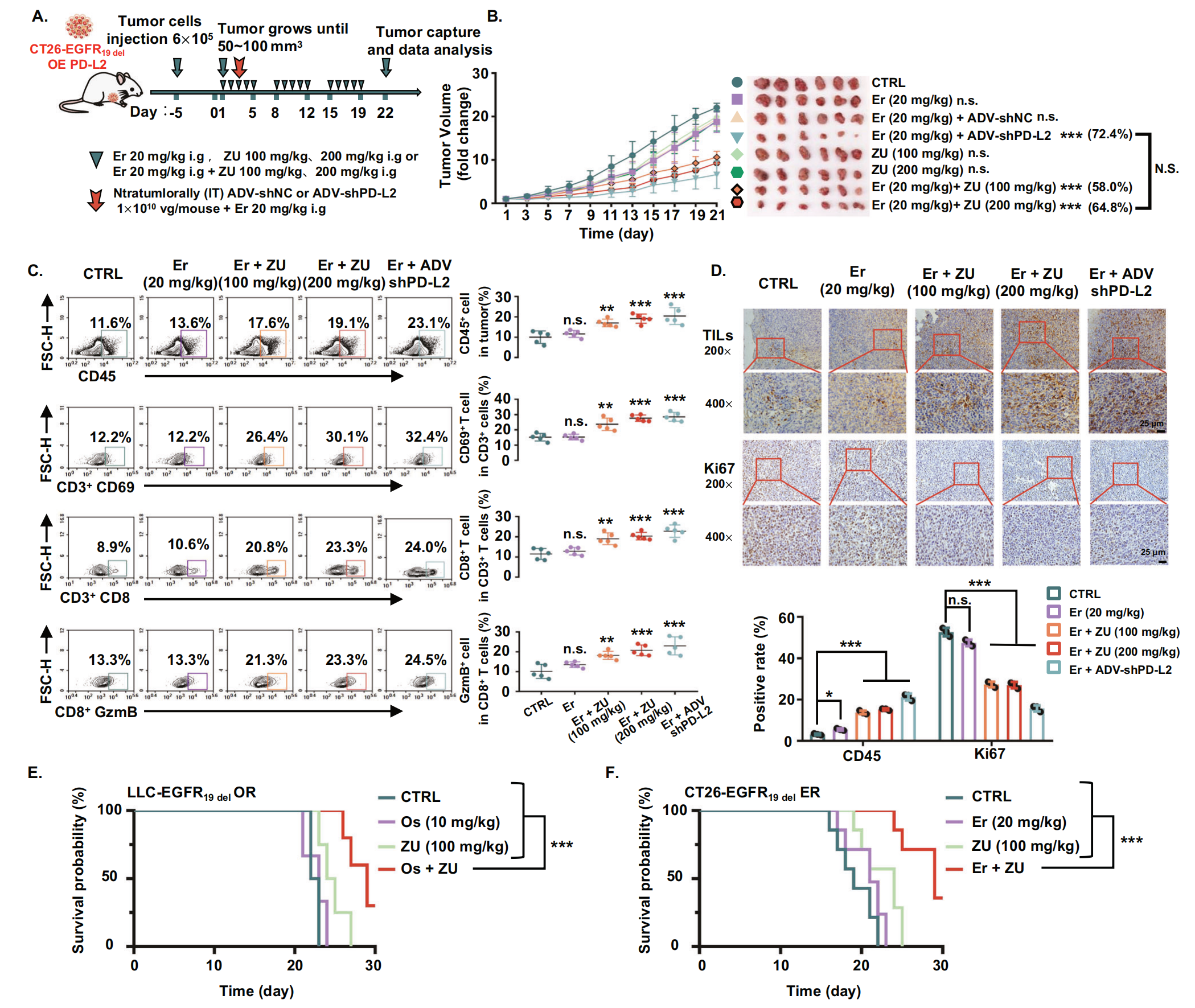 為了進一步證實 ZU 和 EGFR-TKIs 的組合協(xié)同改善腫瘤免疫環(huán)境并逆轉(zhuǎn)腫瘤耐藥性,作者評估了 ZU + 厄洛替尼在攜帶 PD-L2 過表達的 CT26-EGFR19del?來源的腫瘤的 BALB/c 同基因小鼠中的療效(圖9A)。腫瘤體積曲線顯示,與鹽水處理組相比,單獨使用厄洛替尼在治療 15 天后表現(xiàn)出邊緣性腫瘤生長抑制(圖9B),這表明 PD-L2 的過表達增加了腫瘤細(xì)胞對 TKI 的耐藥性。ZU 單次治療并未阻斷腫瘤生長(圖9B),這表明單獨靶向 PD-L2 不能逆轉(zhuǎn)厄洛替尼耐藥性。正如預(yù)期的那樣,陽性對照組 (Er + ADVshPD-L2) 在所有測試的模型中反應(yīng)最好(圖9B)。此外,ZU + 厄洛替尼組與陽性對照組相比沒有顯著差異,這表明 ZU 可以有效抑制 PD-L2,并且當(dāng)與厄洛替尼聯(lián)合使用時,可以顯著逆轉(zhuǎn)厄洛替尼耐藥性(圖9B)。此外,流式細(xì)胞術(shù)和免疫組化結(jié)果顯示,聯(lián)合治療增加了腫瘤組織中浸潤白細(xì)胞(CD45+)的比例、T 細(xì)胞的活化 (CD3+CD69+)以及CD8+?T 細(xì)胞(CD8+GzmB+)的比例和功能(圖9C)。免疫組化顯示,聯(lián)合治療顯著抑制了增殖(圖9D)。為了全面評價 EGFR-TKIs 聯(lián)合 ZU 的療效,作者建立了攜帶對奧希替尼耐藥的 LLC-EGFR19del?衍生腫瘤和對厄洛替尼耐藥的 CT26 EGFR19del?衍生腫瘤的同基因小鼠模型。小鼠接受生理鹽水(CTRL)、單獨 EGFR-TKIs、 單獨 ZU和EGFR-TKIs + ZU處理。作者的結(jié)果表明,與生理鹽水組相比,單獨使用 EGFR-TKIs 組或單獨使用 ZU 組小鼠的生存時間沒有顯著差異(圖9E, F)。然而,ZU 和 EGFR-TKIs(奧希替尼或厄洛替尼)的組合顯著延長了攜帶耐藥腫瘤的小鼠的生存期(圖9E,F(xiàn))。這些結(jié)果表明,ZU 聯(lián)合 EGFR-TKIs 可以通過改善同基因小鼠模型中的腫瘤免疫環(huán)境來有效逆轉(zhuǎn)對 EGFR-TKIs 的耐藥性。綜上所述,ZU 通過抑制 PD-L2 增強 CD8+?T 細(xì)胞的功能,其與 EGFR-TKIs 的聯(lián)合作用可有效抑制耐藥腫瘤的增殖。