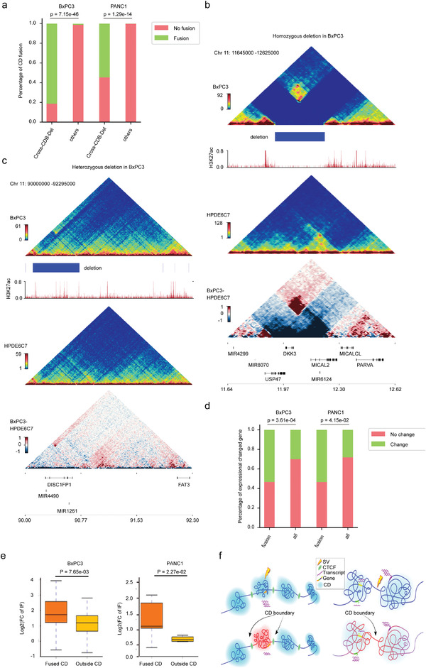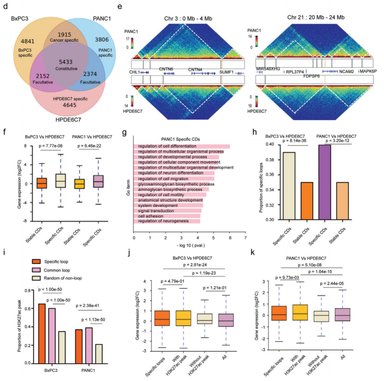 分析了兩個(gè)癌細(xì)胞系中CD融合與差異基因表達(dá)之間的相關(guān)性。結(jié)果表明,融合CD中差異表達(dá)基因的比例明顯高于基因組其他區(qū)域,總的來說,這些數(shù)據(jù)表明,癌癥特異性SV可以通過重塑PDAC中的CD來調(diào)節(jié)基因表達(dá)。