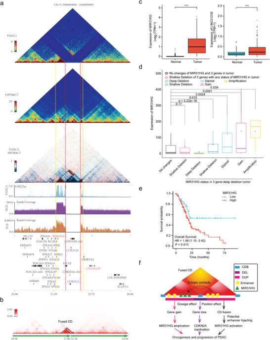 CDKN2A失活通過各種機(jī)制發(fā)生在約90%的PDAC中,其中純合子缺失是常見的途徑之一。此次研究證實(shí)了BxPC3和PANC1中CDKN2A的純合子缺失,發(fā)現(xiàn)缺失兩側(cè)相鄰CD之間的相互作用顯著增強(qiáng),形成融合CD,相鄰CD區(qū)域之間的內(nèi)部相互作用也顯著增強(qiáng)。發(fā)現(xiàn)CDKN2A、CDKN2B和MTAP(缺失區(qū)域的基因)的表達(dá)幾乎消失了,而MIR31HG和LINC01239(缺失區(qū)域兩側(cè)的基因)的表達(dá)被顯著上調(diào)。發(fā)現(xiàn)MIR31HG表達(dá)高患者的生存率顯著縮短(圖5e),與MIR31HG在PDAC中的致癌作用一致。該研究揭示了CDKN2A純合子缺失對(duì)三維基因組結(jié)構(gòu)和基因表達(dá)的影響,為了解CDKN2A失活以推動(dòng)PDAC的發(fā)生和發(fā)展提供了新的見解。