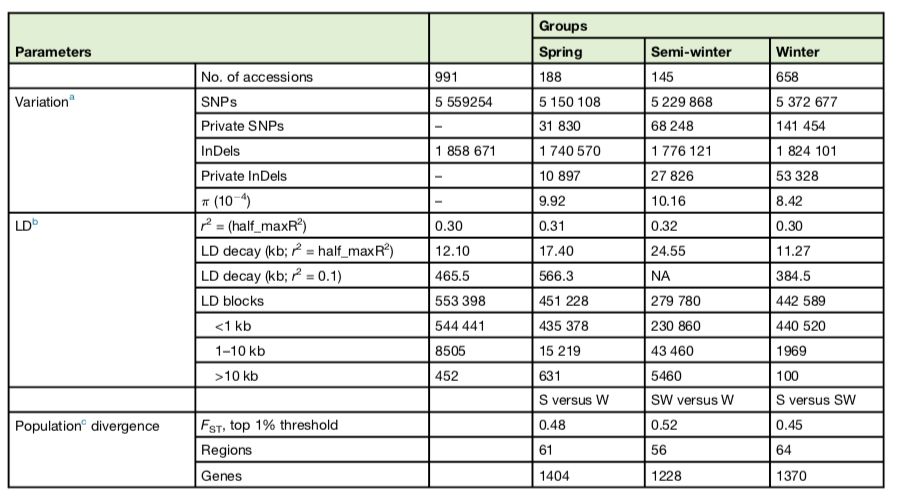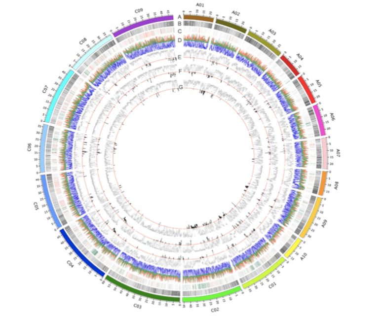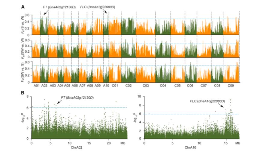 該研究對(duì)991份油菜天然種質(zhì)資源進(jìn)行了遺傳多樣性的測(cè)序和鑒定。通過(guò)對(duì)兩個(gè)不同的參考基因組,即“Darmor-bzh”和“Tapidor”基因組的定位讀數(shù)產(chǎn)生的兩組SNPs的群體遺傳學(xué)分析,得出了一致的結(jié)論。遺傳多樣性和連鎖不平衡參數(shù)表明甘藍(lán)型油菜兩個(gè)亞基因組的進(jìn)化是不對(duì)稱(chēng)的。選擇性掃描分析揭示了與調(diào)控植物發(fā)育和應(yīng)激反應(yīng)的各個(gè)方面相關(guān)的基因的遺傳變化。并對(duì)影響開(kāi)花時(shí)間的SNPs進(jìn)行了探索。