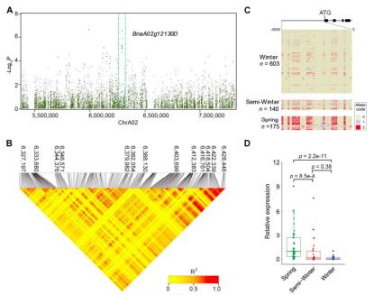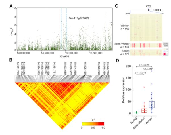 BnaA10g22080D是擬南芥FLC的一個(gè)假定的同源基因,在Chr.A10的14.99-15.01 Mb之間的區(qū)域內(nèi)被鑒定(圖3B)。GWAS和LD分析表明,BnaA10g22080D的5’調(diào)控區(qū)的SNPs與品種間開(kāi)花時(shí)間的變化顯著相關(guān)(圖6A和6B)。
