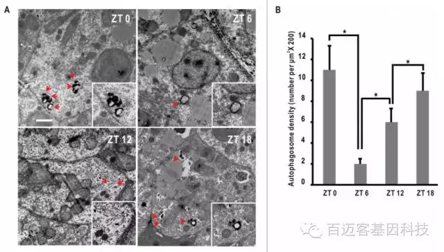 首先用TEM(透射電鏡)對一天內(nèi)不同時間(ZT0,ZT6,ZT12,ZT18)的肝臟切片進行觀察,統(tǒng)計一天內(nèi)自噬體數(shù)量的變化(紅色箭頭處,圖1,A),并進行統(tǒng)計(圖1,B),研究表明斑馬魚肝臟內(nèi)自噬體的數(shù)量符合生物鐘節(jié)律。