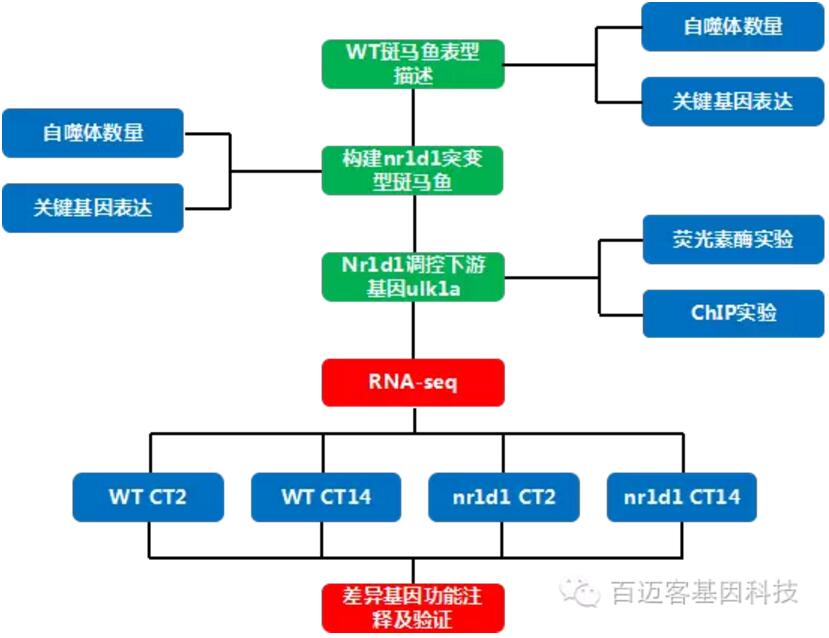 通過研究WT野生型和nr1d1突變型斑馬魚的基因表達情況,表明Nr1d1基因在生物鐘調(diào)節(jié)和細(xì)胞自噬過程中起著重要作用。生物鐘相關(guān)基因直接受Nr1d1調(diào)控。此外,通過轉(zhuǎn)錄組分析表明Nr1d1還調(diào)控脅迫、代謝、信號傳導(dǎo)、翻譯后修飾等生理過程。