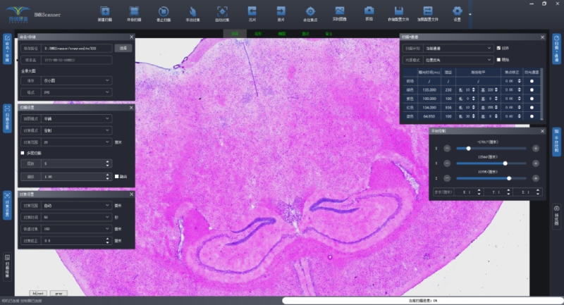 可以利用BH1000對(duì)明場(chǎng)及熒光掃描過(guò)程中經(jīng)常出現(xiàn)的拼接錯(cuò)誤進(jìn)行校準(zhǔn)(自主研發(fā)BMCHiper軟件,搭配自研半透半返模塊,實(shí)現(xiàn)圖像無(wú)錯(cuò)校準(zhǔn)),得到原片無(wú)錯(cuò)高清的熒光圖像與原片無(wú)錯(cuò)高清的明場(chǎng)圖像,為后續(xù)空間數(shù)據(jù)準(zhǔn)確的定位和可視化提供基礎(chǔ),使得復(fù)雜的轉(zhuǎn)錄組數(shù)據(jù)能夠轉(zhuǎn)化為最直觀,最精準(zhǔn)的生物學(xué)見解。
