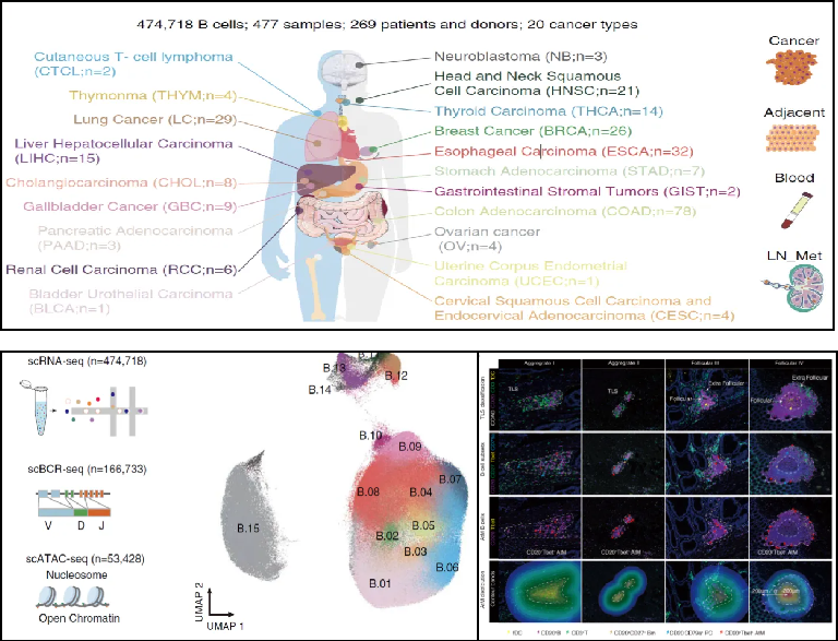 2024年,復(fù)旦大學(xué)附屬中山醫(yī)院樊嘉院士和高強(qiáng)教授、中國(guó)科學(xué)院上海免疫與感染研究所張曉明研究員、浙江大學(xué)基礎(chǔ)醫(yī)學(xué)院郭國(guó)驥教授合作在Science上發(fā)表了題為A blueprint for tumor-infiltrating B cells across human cancers的研究論文,結(jié)合單細(xì)胞轉(zhuǎn)錄組、 B細(xì)胞受體免疫組庫(kù)和表觀基因組的多組學(xué)數(shù)據(jù),系統(tǒng)性地刻畫了腫瘤浸潤(rùn)性B細(xì)胞的異質(zhì)性、動(dòng)態(tài)分化和表觀調(diào)控機(jī)制。創(chuàng)新地揭示了腫瘤微環(huán)境中廣泛存在的EF應(yīng)答的癌種偏好性、空間定位特征、臨床意義及潛在的誘導(dǎo)調(diào)控機(jī)制。
