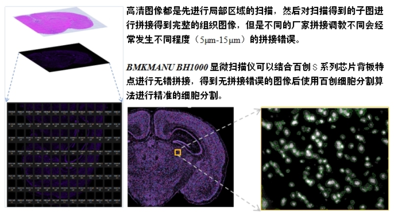 BMKMANU BH1000是專門適配精準(zhǔn)空間組學(xué)BMKMANU S系列產(chǎn)品的成像系統(tǒng),它不僅可以實(shí)現(xiàn)各類物種及各類玻片標(biāo)本的快速全切片掃描成像,還能能夠滿足百創(chuàng)空間組學(xué)中各個(gè)實(shí)驗(yàn)環(huán)節(jié)的成像需求,更能搭配使用百創(chuàng)細(xì)胞分割算法,結(jié)合其輸出的原片無(wú)錯(cuò)高清明場(chǎng)成像,原片無(wú)錯(cuò)高清熒光成像實(shí)現(xiàn)精準(zhǔn)空間單細(xì)胞分割。