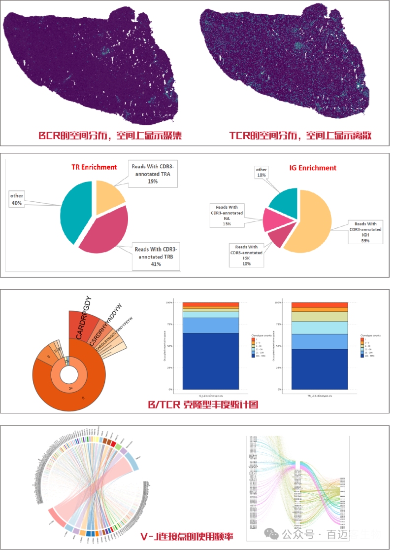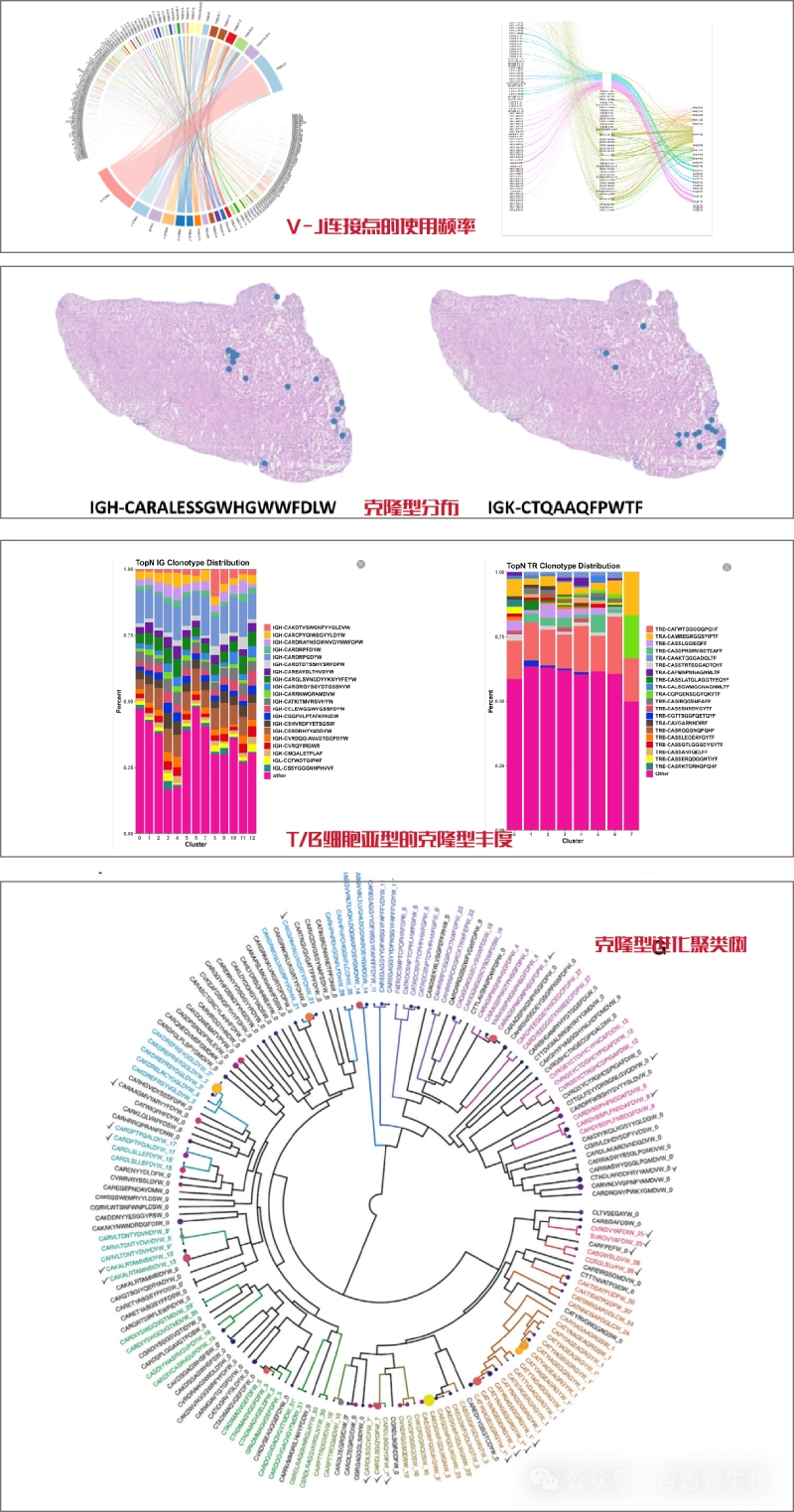 腫瘤樣本我們可以類比為一處具有復(fù)雜地貌的特殊地理環(huán)境,不同的環(huán)境造就了各種細(xì)胞的不同狀態(tài),而T/B細(xì)胞在不同的“選擇壓力”下邊進(jìn)行了不同的“適應(yīng)性進(jìn)化”。對(duì)不同生態(tài)位的T/B細(xì)胞尤其是TCR/BCR進(jìn)行測(cè)定,有助于我們?nèi)ソ沂久庖呒?xì)胞的克隆起源和進(jìn)化過(guò)程。例如,通過(guò)分析TCR的VDJ重排,可以追蹤T細(xì)胞克隆的起源和擴(kuò)增過(guò)程。這種分析有助于理解免疫細(xì)胞在不同生理和病理狀態(tài)下的動(dòng)態(tài)變化。