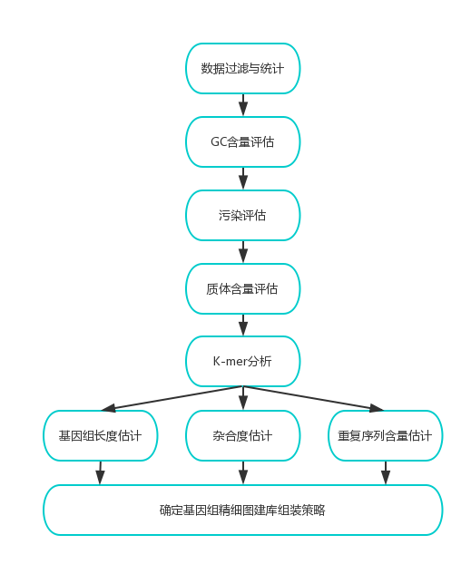 雙端測序數(shù)據(jù)通過評估雙端測序數(shù)據(jù)通過評估(GC分布統(tǒng)計(jì)、質(zhì)量值Q20、Q30評估)、過濾后得到高質(zhì)量的數(shù)據(jù)(clean reads),用于基因組大小的評估、基因組的組裝、GC含量的統(tǒng)計(jì)、雜合率的統(tǒng)計(jì)(以及組裝后的評估)。具體信息分析流程見圖2。