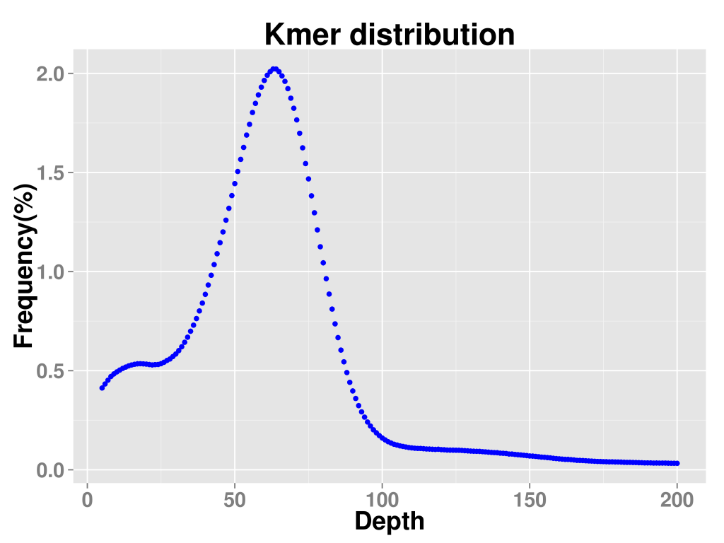 由于基因組存在雜合位點(diǎn)和重復(fù)序列,k-mer曲線往往不會呈現(xiàn)出良好的泊松分布,而是在主峰前后出現(xiàn)其他的峰,如果存在一定雜合度,會導(dǎo)致在主峰對應(yīng)的橫坐標(biāo)的二分之一處出現(xiàn)雜合峰,而一定的重復(fù)度則會在主峰對應(yīng)的橫坐標(biāo)的整數(shù)倍處出現(xiàn)重復(fù)峰。
