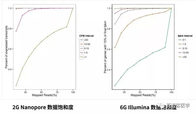 針對(duì)同一樣本進(jìn)行的飽和度分析顯示,2G ONT全長(zhǎng)除表達(dá)量極低的(CPM<1)其他轉(zhuǎn)錄本都達(dá)到飽和了,和二代Illumina 6G除表達(dá)量極低FPKM<1外的基因檢測(cè)也飽和了,且前者更早趨向飽和;
