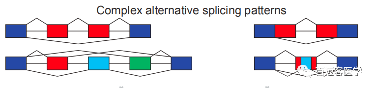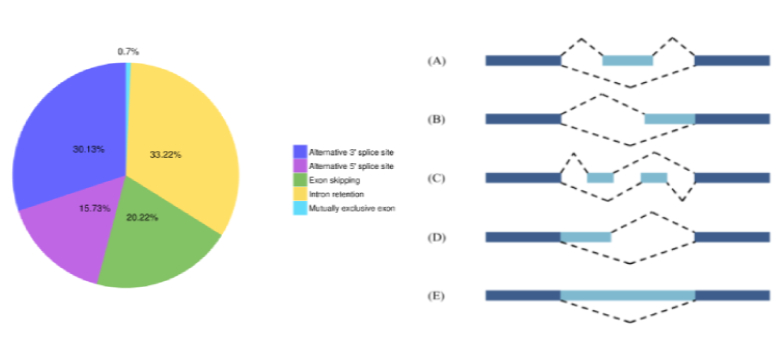 基因轉(zhuǎn)錄生成的前體mRNA(pre-mRNA),有多種剪接方式,選擇不同的外顯子,產(chǎn)生不同的成熟mRNA,從而翻譯為不同的蛋白質(zhì),構(gòu)成生物性狀的多樣性。這種轉(zhuǎn)錄后的mRNA加工過程稱為可變剪接或選擇性剪接(Alternative splicing)??勺兗艚宇愋桶ǎ?A) 外顯子跳躍;(B) 可變轉(zhuǎn)錄終止位點(diǎn);(C) 可變外顯子;(D)可變轉(zhuǎn)錄起始位點(diǎn);(E) 內(nèi)含子保留。