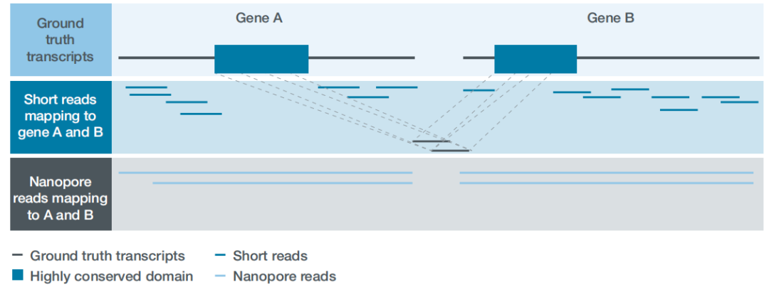 注:上圖中藍(lán)色方塊表示測(cè)到RNA序列中能夠比對(duì)到基因組序列的區(qū)域,即屬于某個(gè)轉(zhuǎn)錄本外顯子區(qū)的reads;灰色線條表示我們測(cè)到的reads回比基因組序列時(shí)中間沒有比對(duì)上的,則用灰色線條連接,即reads不連續(xù)比對(duì),中間被剪接掉的內(nèi)含子區(qū)。從圖中明顯看出,二代短reads比較短,多數(shù)短read單條連一個(gè)外顯子區(qū)都跨越不了,nanopore長(zhǎng)讀長(zhǎng)測(cè)序可以直接得到3種全長(zhǎng)轉(zhuǎn)錄本。其中,Exon2和Exon6以及Exon9是三個(gè)轉(zhuǎn)錄本間共享的,那么對(duì)于完全比對(duì)到這3個(gè)外顯子區(qū)的短reads無(wú)法區(qū)分其來(lái)源轉(zhuǎn)錄本。而三代測(cè)序則直接跨越三個(gè)全長(zhǎng)轉(zhuǎn)錄本,因此對(duì)于轉(zhuǎn)錄本水平表達(dá)定量更準(zhǔn)確。