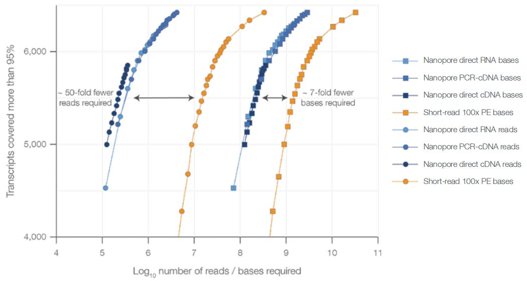 ONT全長(zhǎng)轉(zhuǎn)錄組測(cè)序一條reads即代表該轉(zhuǎn)錄本表達(dá)一次,而二代短reads需要非常多條才能覆蓋一個(gè)轉(zhuǎn)錄本;oxford nanopore公司官方白皮書中數(shù)據(jù)顯示:當(dāng)相同數(shù)量的轉(zhuǎn)錄本被覆蓋達(dá)95%時(shí),ONT所需要的reads數(shù)比Illumina約少50倍,所需要堿基數(shù)約少7倍。