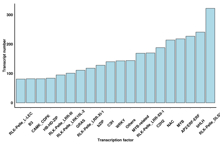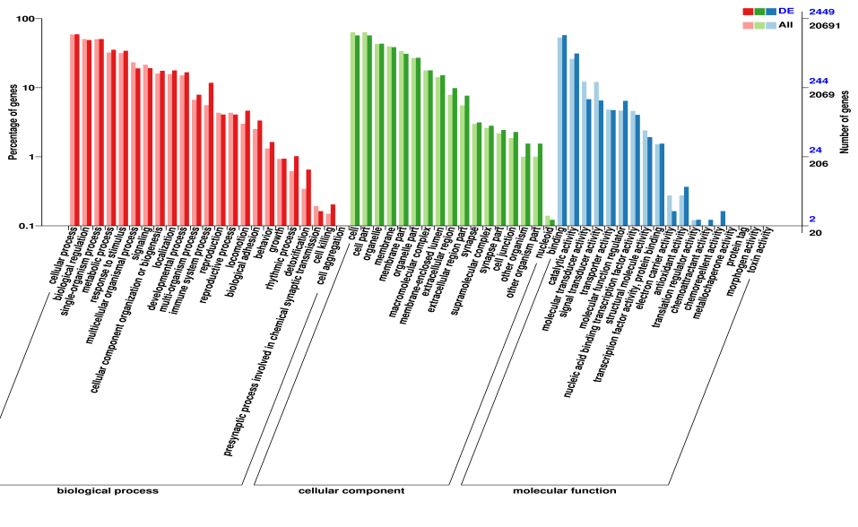 GO注釋分類統(tǒng)計(jì)圖,直觀的反映出在生物過程(biological process)、細(xì)胞組分(cellular component)和分子功能(molecular function),可深入挖掘差異基因和轉(zhuǎn)錄本的功能及所在的信號(hào)通路,篩選關(guān)注差異基因和轉(zhuǎn)錄本注釋情況。