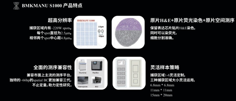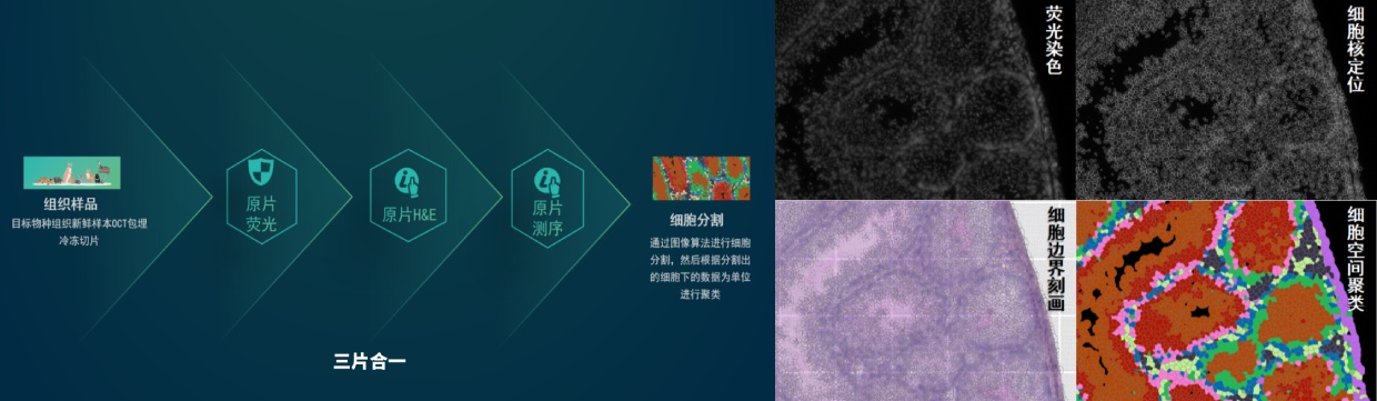 百創(chuàng)智造S系列空間轉(zhuǎn)錄組細(xì)胞分割實(shí)現(xiàn)原理: 三圖合一 百創(chuàng)智造基于S系列空間芯片的底層設(shè)計(jì),開(kāi)發(fā)出了自己的核心技術(shù),可以得到完全沒(méi)有錯(cuò)誤的原片熒光圖像以及H&E圖像且與芯片完全對(duì)齊?;跓晒膺M(jìn)行細(xì)胞核的定位刻畫(huà)細(xì)胞核的邊界;基于HE的校準(zhǔn)輔助刻畫(huà)細(xì)胞的邊界,通過(guò)邊界信息映射到芯片上,提取相應(yīng)位置的測(cè)序數(shù)據(jù),實(shí)現(xiàn)精準(zhǔn)的單細(xì)胞分割。