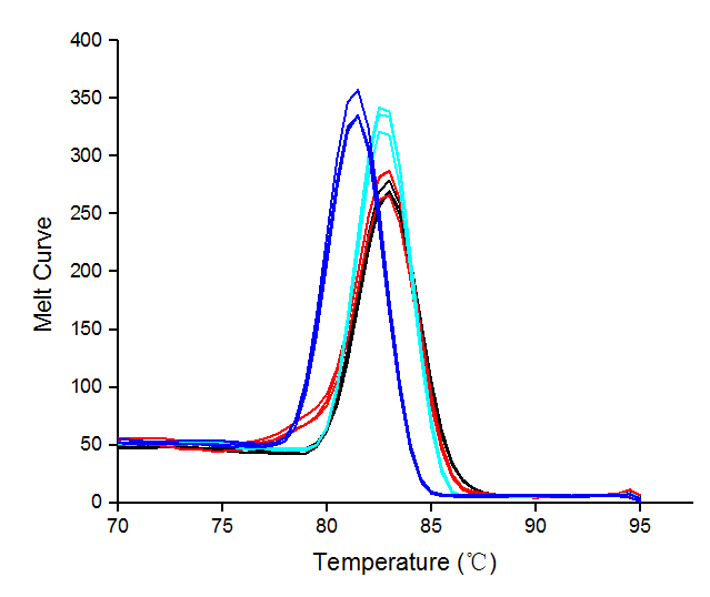 圖2:以1 μg不同物種的RNA為模板(藍(lán)色:人肝癌細(xì)胞;青色:雞;紅色:斑馬魚;黑色:水稻種子),用BiomarkerScript Ⅱ 1st Strand cDNA Synthesis Kit進(jìn)行逆轉(zhuǎn)錄,得到cDNA產(chǎn)物。再以100 ng不同物種的 cDNA為模板,用反復(fù)凍融10次以上的Biomarker 2× SYBR Green Fast qPCR Mix進(jìn)行qPCR擴(kuò)增。結(jié)果所示:溶解曲線呈現(xiàn)特征單峰。