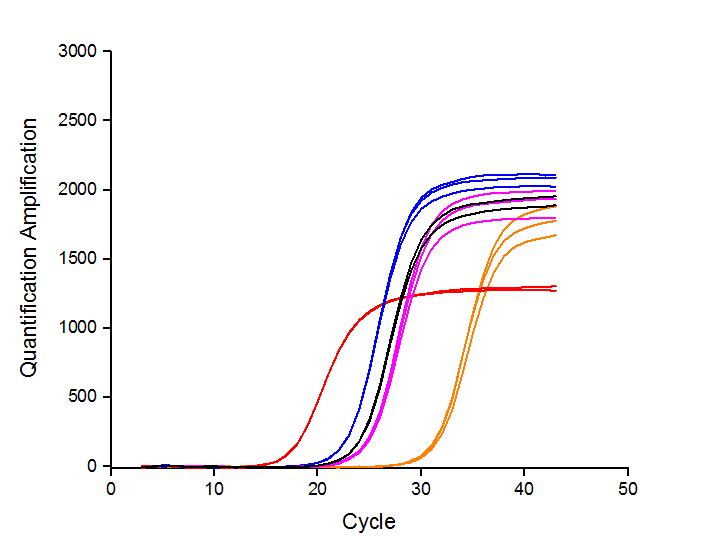 圖3:以1 μg不同物種的RNA為模板(紅色:人肝癌細(xì)胞;藍(lán)色:雞;黑色:斑馬魚;紫色:水稻種子;黃色:番茄果),用BiomarkerScript Ⅱ 1st Strand ?cDNA Synthesis Kit進(jìn)行逆轉(zhuǎn)錄,得到cDNA產(chǎn)物。再以100 ng不同物種的 cDNA為模板,用Biomarker 2×SYBR Green Fast qPCR Mix進(jìn)行qPCR擴(kuò)增。結(jié)果所示:試劑盒可完美識(shí)別目標(biāo)基因擴(kuò)增,特異性極高。