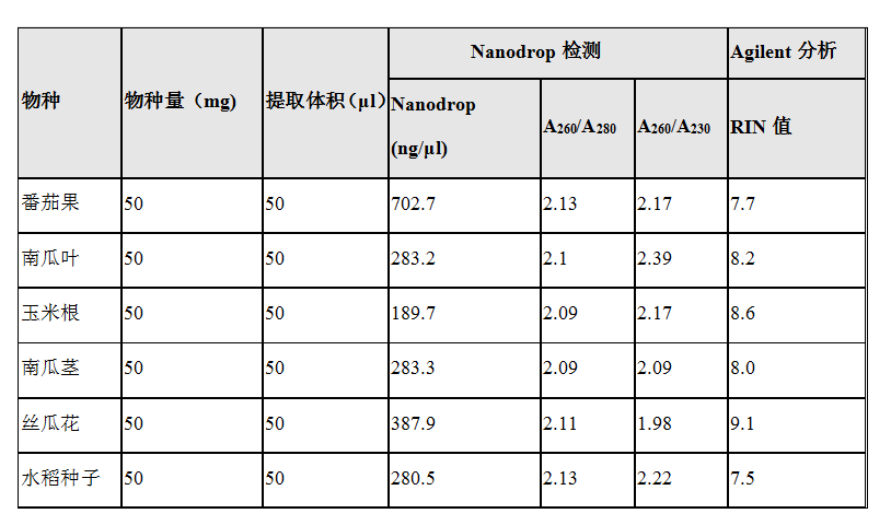 該本試劑盒可以從植物組織,特別是富含多糖多酚或淀粉的植物組織(如成熟水稻葉片,棉花葉片,擬南芥種子,香蕉,馬鈴薯塊莖,蘋果,西瓜果肉,獼猴桃,梨,月季,煙草,沙棘,百合等)中快速提取總RNA,提取的RNA可用于可用于RT-PCR、qPCR、普通轉(zhuǎn)錄組測序、全長轉(zhuǎn)錄組測序等多種下游實驗。