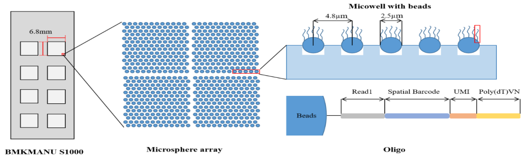 百創(chuàng)S1000(BMKMANU S1000)是由百邁客生物設計并研發(fā)而來的基于微孔微珠上Spatial Barcode實現(xiàn)對組織切片mRNA分子捕獲的亞細胞級空間轉錄組芯片。百創(chuàng)S1000可以廣泛應用于生物器官發(fā)育、神經科學、免疫感染、脅迫應激、生物遺傳進化等生命科學領域的研究。