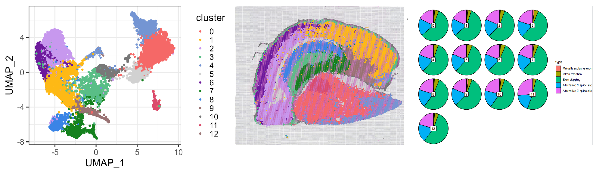 二代與三代數據的UMI/Gene counts per spot的相關性還是tSEN/UMAP的降維聚類,都顯示具有非常高的一致性。這充分說明百創(chuàng)S1000-Nanopore全長轉錄組產品完全可以獨立進行數據的拆分與挖掘分析,無需依賴NGS數據的校正。